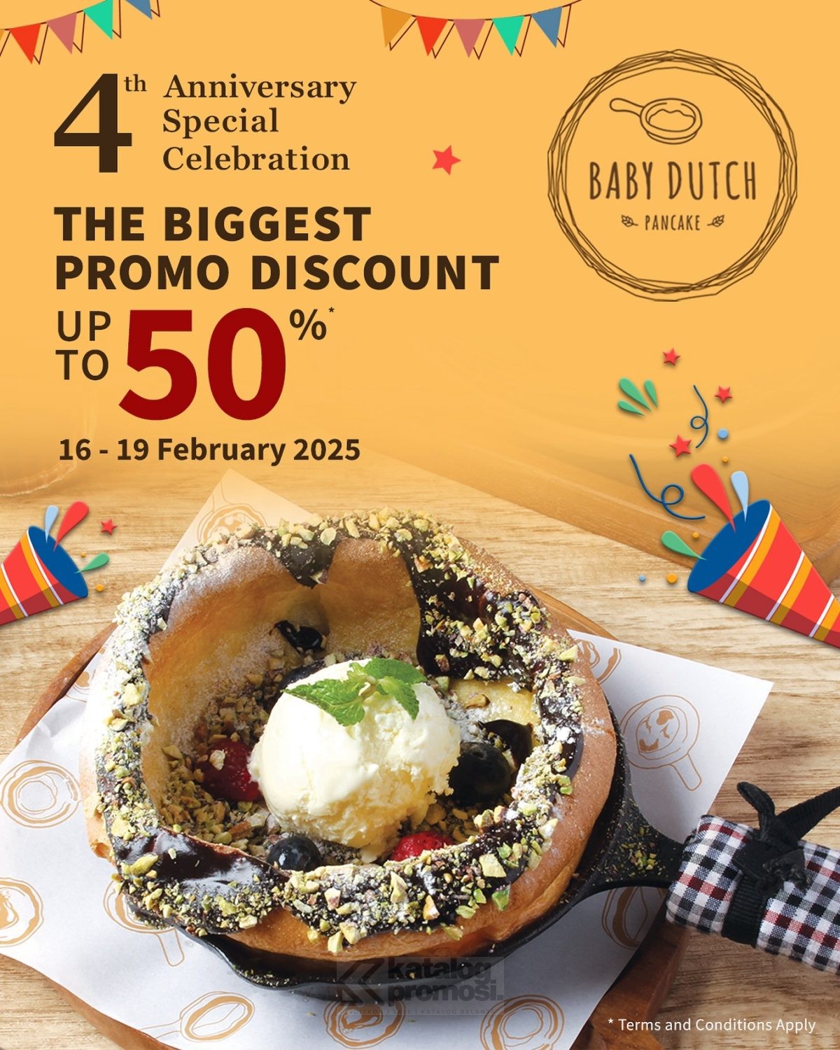 Promo Baby Dutch Pancake Anniversary! Diskon hingga 50% untuk pembelian Sweet Pancake di seluruh outlet Baby Dutch. Berlaku 16 – 19 Februari 2025, khusus dine-in!