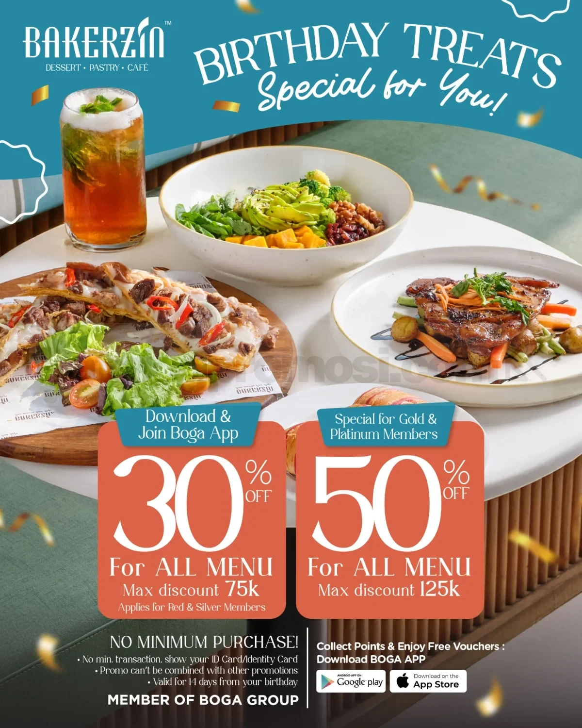 Promo Bakerzin Birthday Treats Diskon hingga 50% untuk semua menu dengan Boga App, berlaku mulai tanggal ulang tahun hingga 14 hari setelahnya di seluruh outlet.