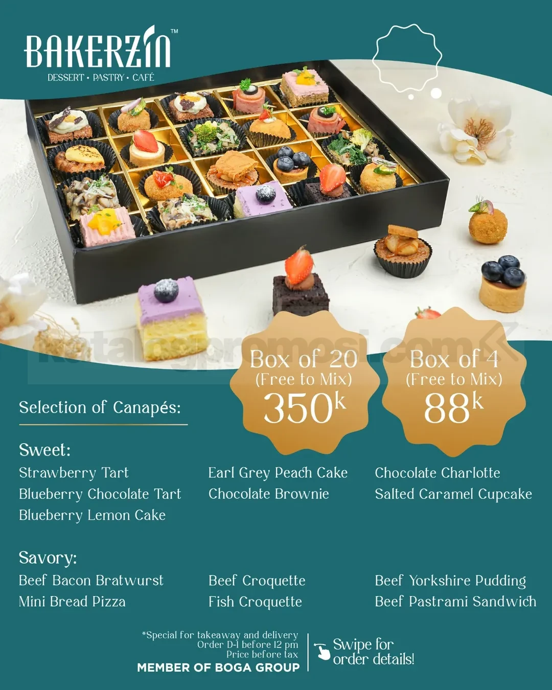 Promo Bakerzin Canapé To Go mulai Rp. 88.000 tersedia untuk takeaway dan delivery, cocok untuk berbagai acara dari kumpul santai sampai perayaan mewah.