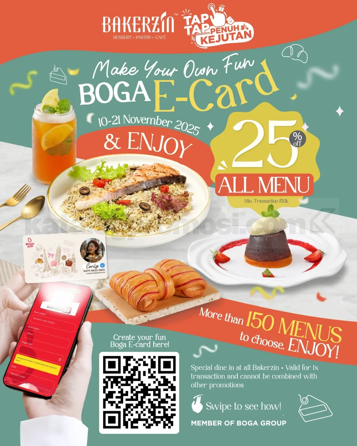 Cukup scan QR code di outlet Bakerzin atau kunjungi kejutan.boga.id, buat BOGA E-Card kamu, dan tunjukkan saat transaksi. Promo ini berlaku 10–21 November 2025, dengan minimal transaksi Rp. 150.000, dan bisa kamu nikmati di seluruh outlet Bakerzin untuk dine-in. 💚