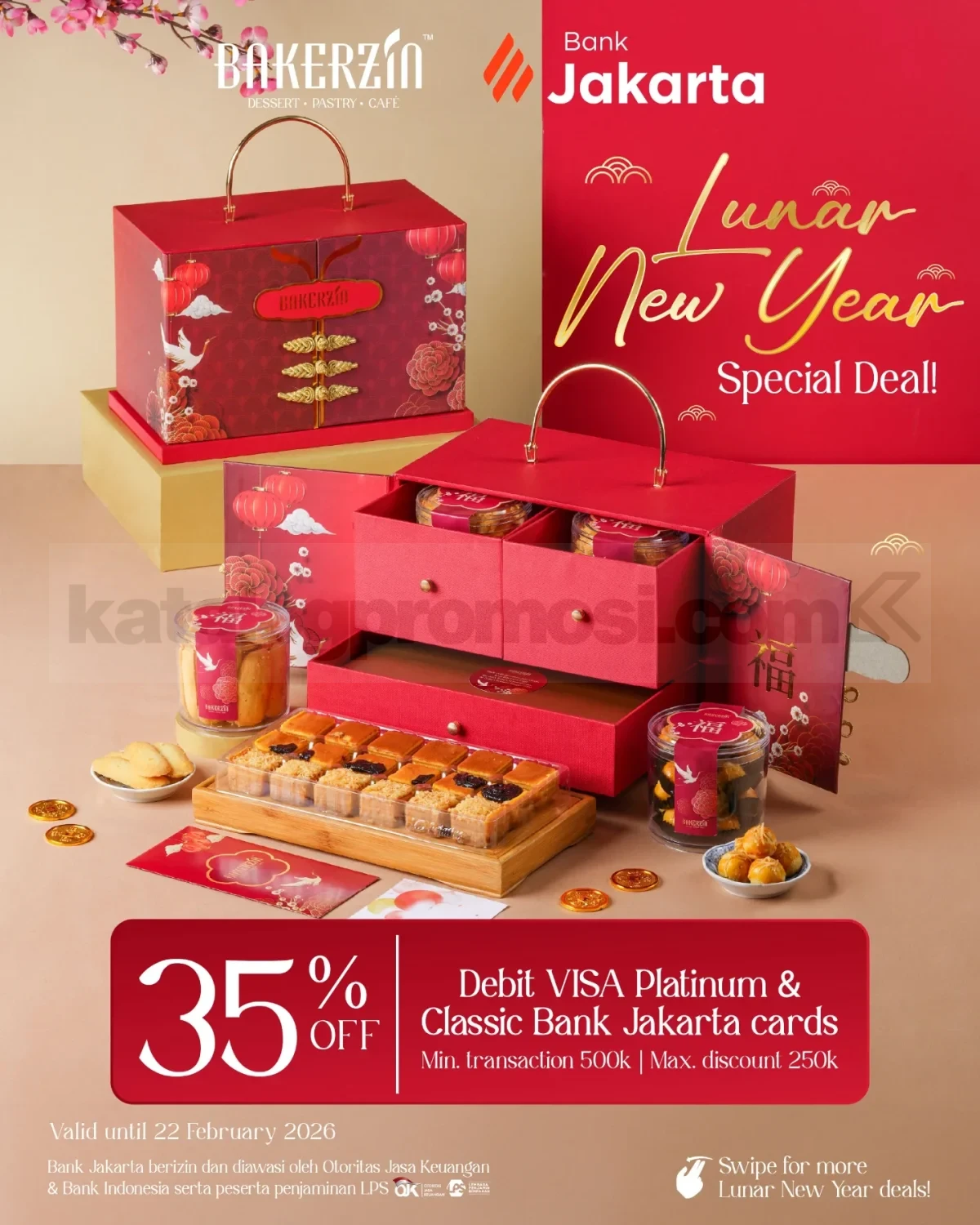 Promo Bakerzin Lunar New Year Hampers Diskon Hingga 35% untuk hampers Imlek & dine-in dengan kartu bank pilihan berlaku sampai tanggal 22 Februari 2026.