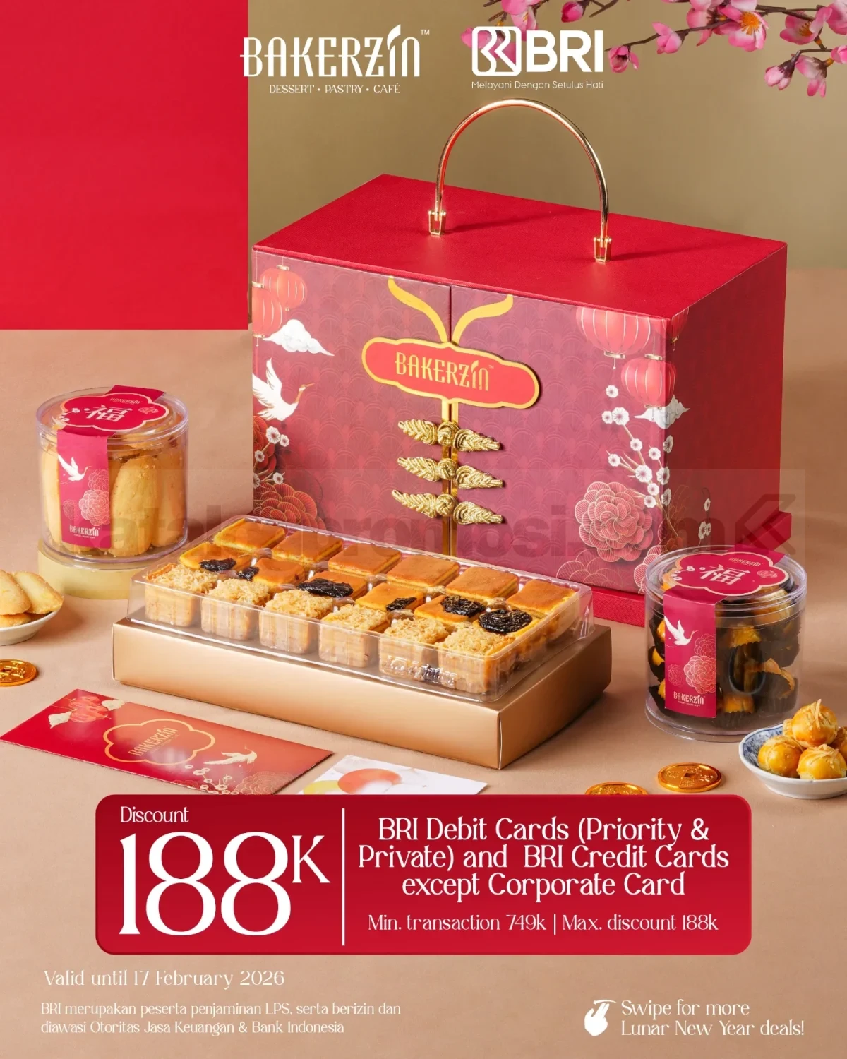 Dalam periode spesial Tahun Baru Imlek, Bakerzin menghadirkan penawaran bank eksklusif yang berlaku untuk pembelian Chinese New Year Hampers maupun transaksi dine-in. Jadi selain bisa mengirim hampers cantik untuk kolega dan orang tersayang, kamu juga bisa menikmati hidangan favorit di outlet dengan potongan harga yang signifikan.