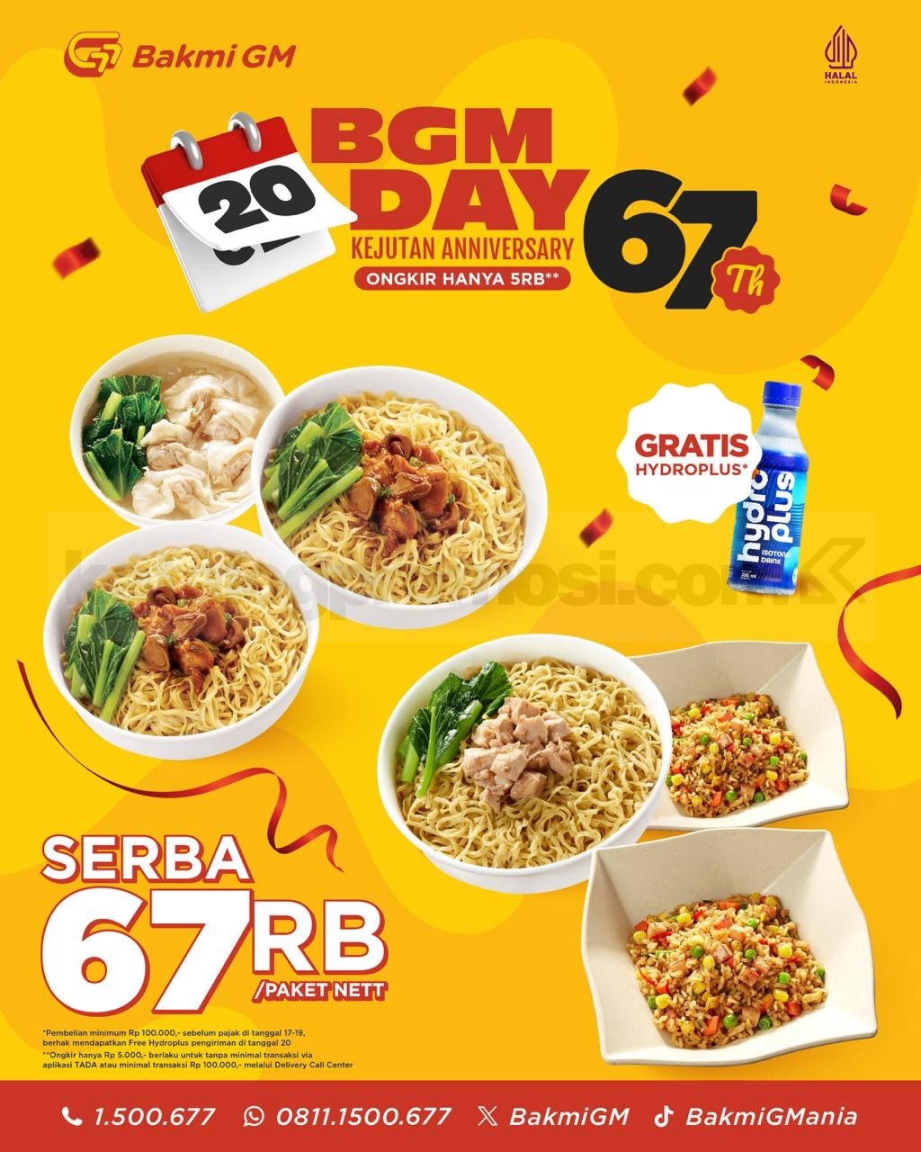 Promo Bakmi GM BGM DAY 67 Th Serba 67RIBU berlaku mulai 17 β 20 Februari 2026 dengan paket Rp. 67.000 dan GRATIS Hydroplus sesuai ketentuan.