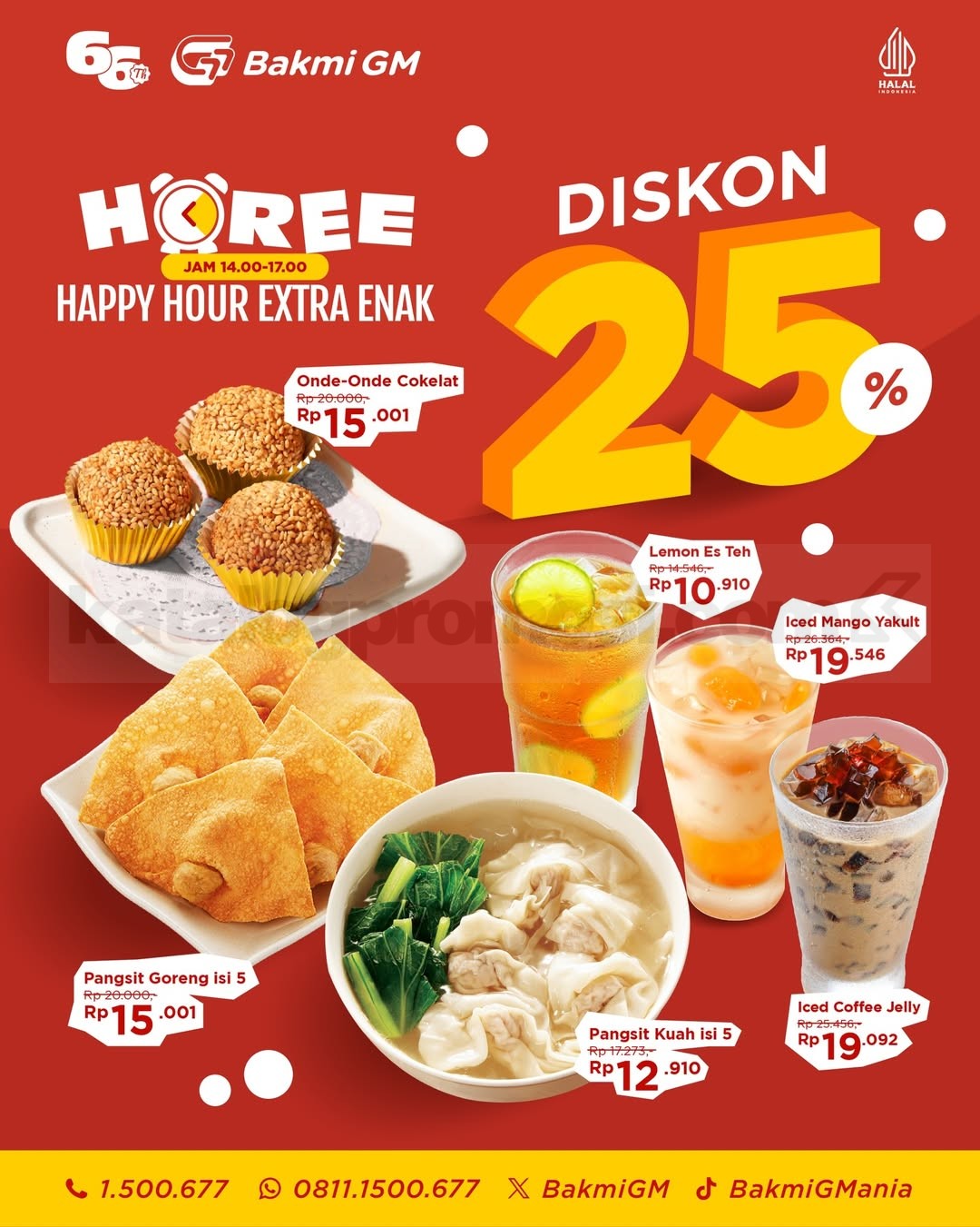 Promo Bakmi GM Happy Hour Extra Enak mulai Rp. 10.910, nikmati minuman & camilan favorit setiap Senin-Jumat pukul 14.00–17.00 WIB, berlaku 3–31 Desember 2025.