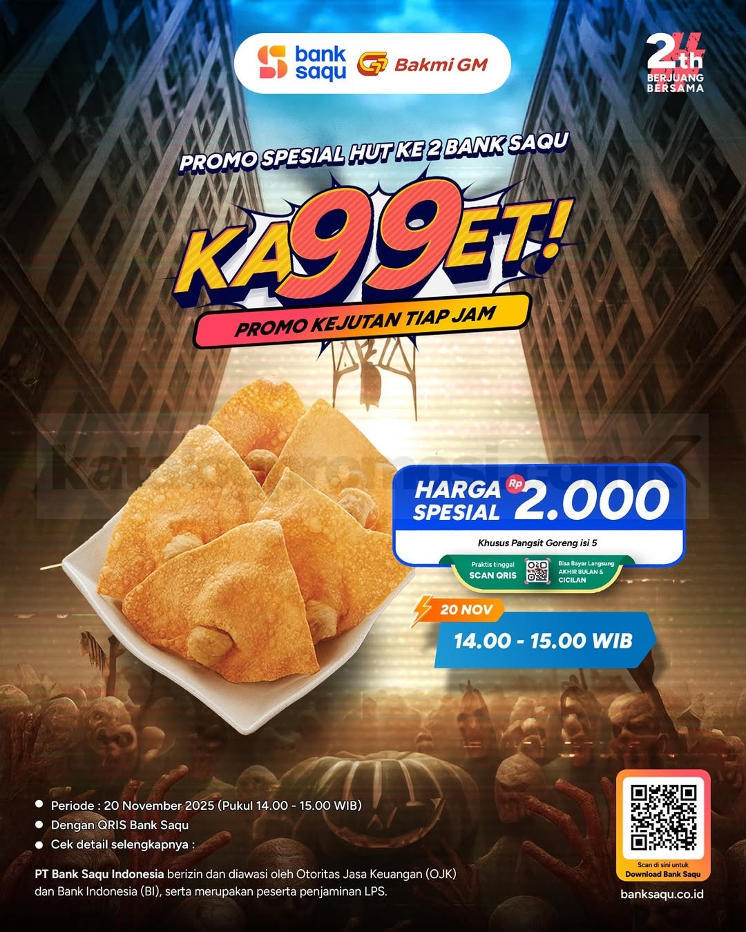 Promo Bakmi GM HUT ke-2 Bank Saqu Pangsit Goreng isi 5 Rp2.000 berlaku 20 November 2025, 14.00–15.00 WIB selama kuota tersedia