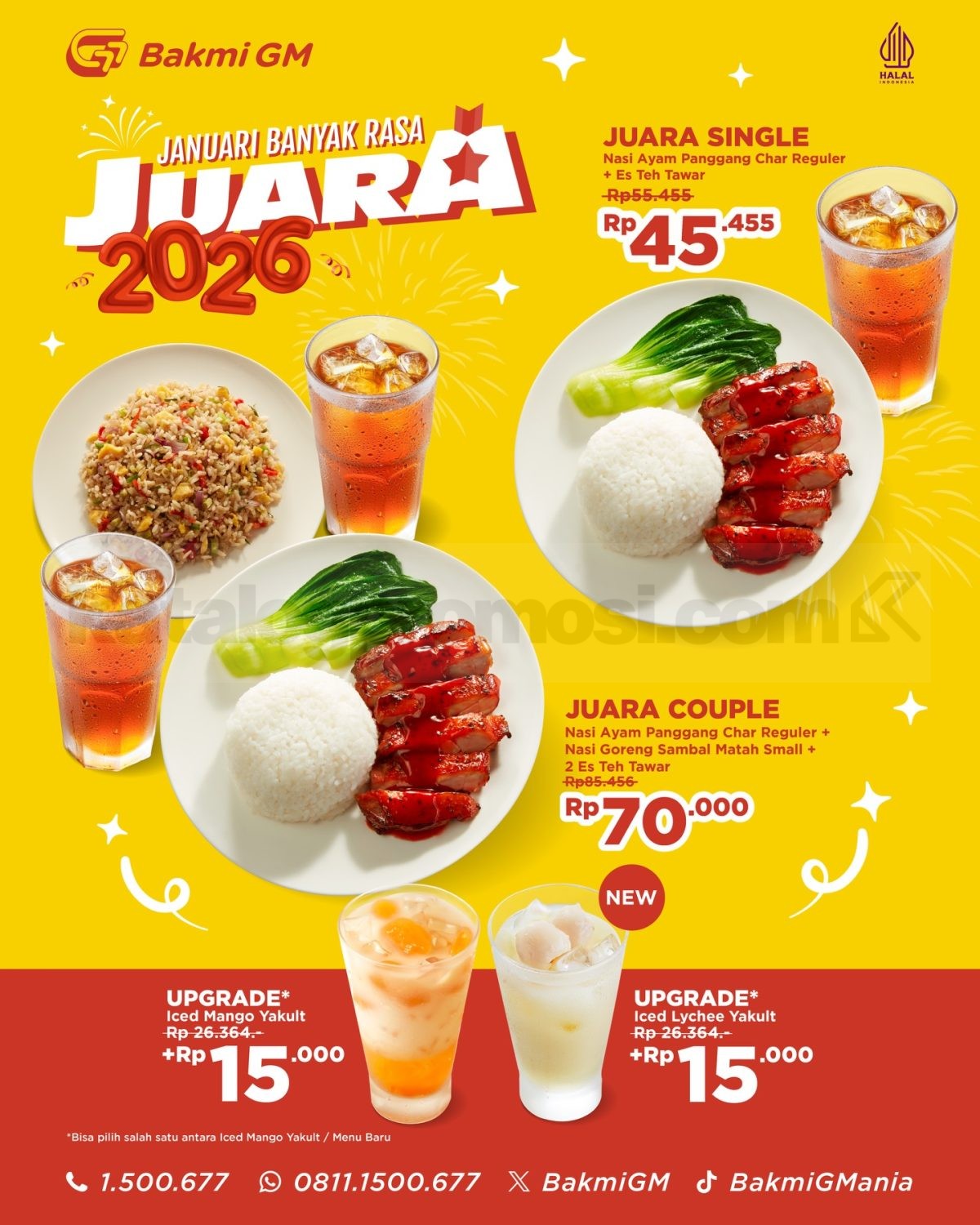 Promo Bakmi GM JUARA Januari Banyak Rasa mulai Rp. 45.455 dengan paket nasi ayam panggang dan es teh tawar, berlaku mulai tanggal 2 Januari 2026 – 31 Januari 2026 di seluruh outlet.