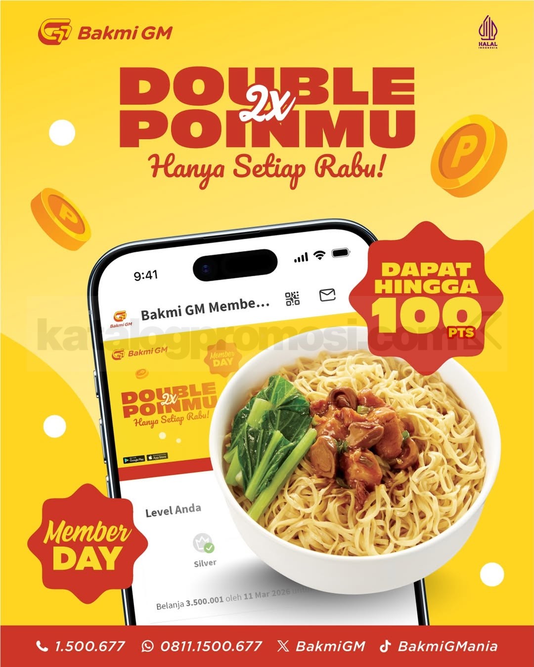 Promo Bakmi GM Member Day Double Poin hingga 100 poin, member dapat poin 2x lipat setiap Rabu berlaku selama program berlangsung di seluruh outlet.