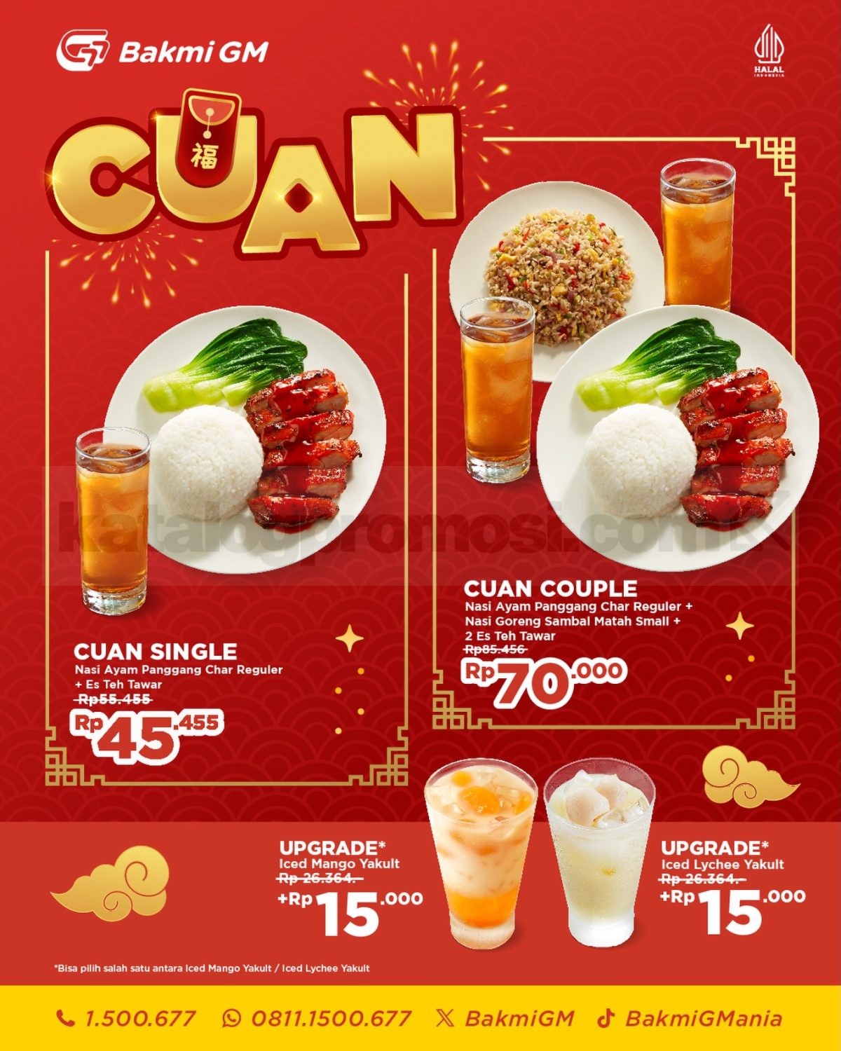 Promo Bakmi GM Paket CUAN mulai Rp. 45.455 dengan pilihan paket makan sendiri dan berdua plus upgrade minuman Yakult, berlaku mulai tanggal 1-17 Februari 2026 di outlet tertentu.
