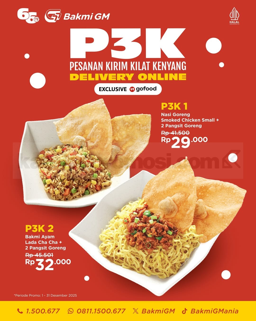 Promo Bakmi GM Pesanan Kirim Kilat Kenyang mulai Rp. 29.000, nikmati Nasi Goreng Smoked Chicken atau Bakmi Ayam Lada Cha Cha + 2 Pangsit Goreng, berlaku 1–31 Desember 2025 via GoFood.