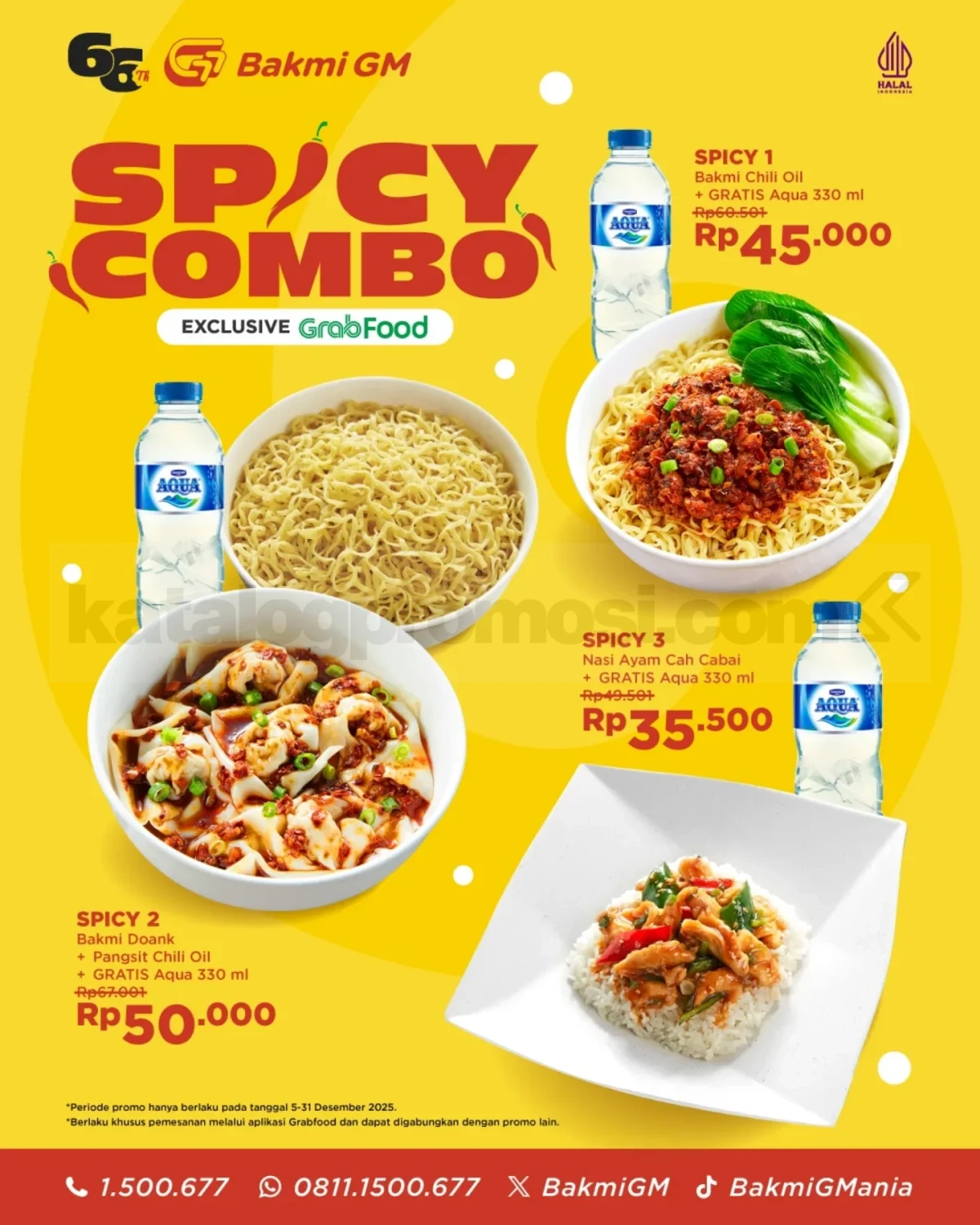 Promo Bakmi GM Spicy Combo GrabFood mulai Rp. 35.500 dengan paket pedas lengkap plus Aqua gratis, berlaku mulai tanggal 5 Desember 2025 – 31 Desember 2025.