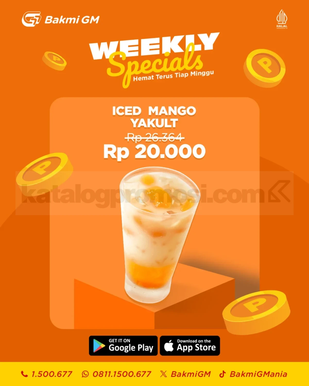 Yuk, nikmati kesegaran Iced Mango Yakult harga Rp. 20.000 lewat Weekly Specials Bakmi GM. Klaim e-vouchernya di aplikasi dan rasakan sensasi minuman fresh favoritmu di outlet terdekat.
