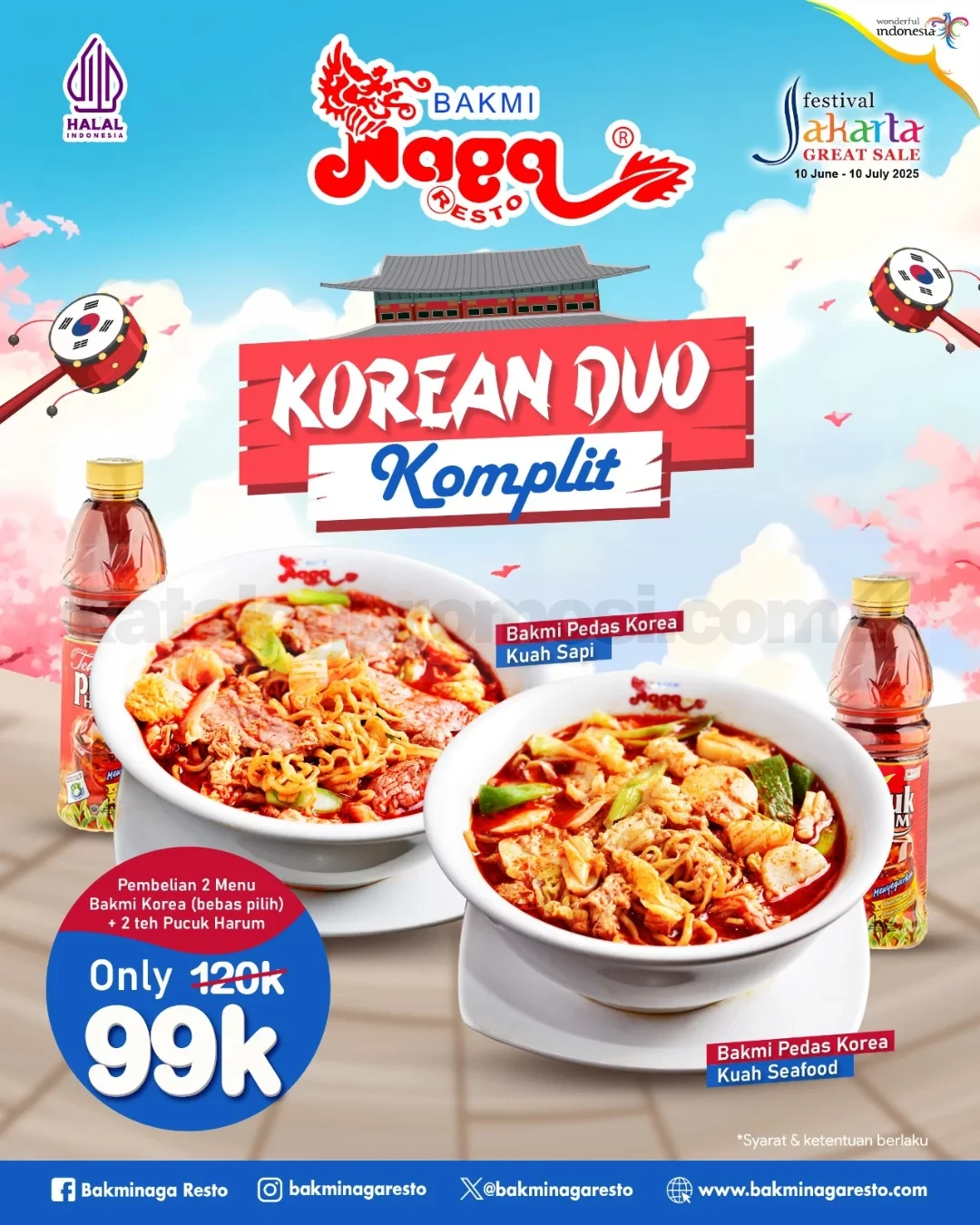 Buat yang lagi cari makan enak tapi tetep hemat, Promo Bakmi Naga Resto spesial HUT Jakarta ke-498 ini wajib banget kamu serbu! Di momen ulang tahun Jakarta yang ke-498, Bakmi Naga bagi-bagi kebahagiaan lewat promo super hemat: Korean Duo Komplit cuma 99K aja! 🥳