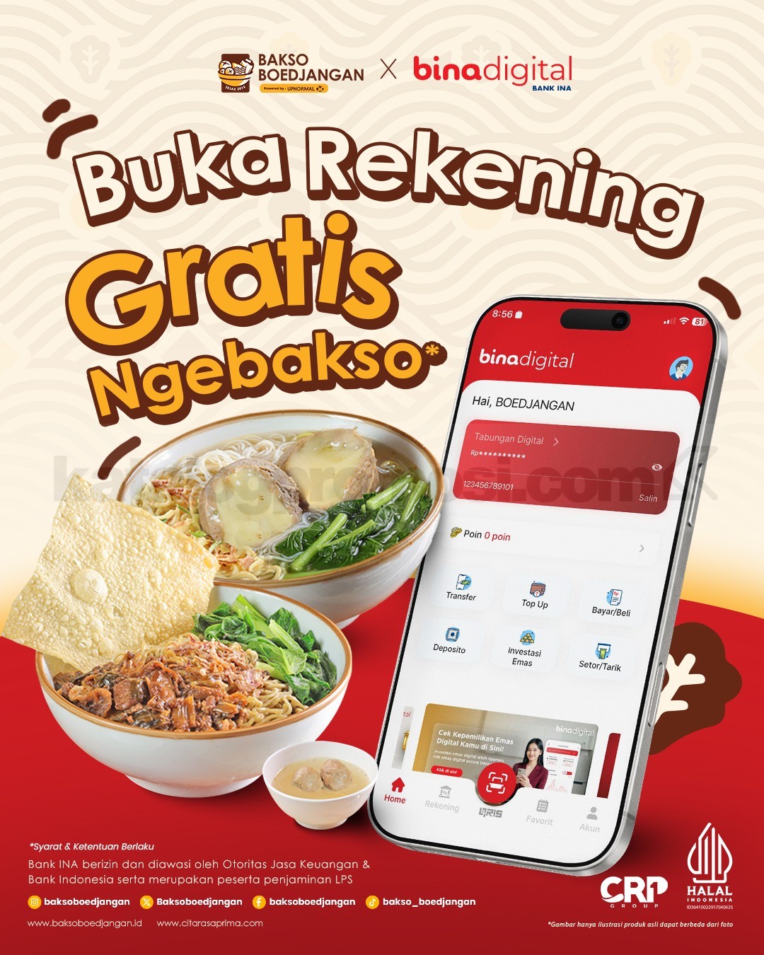 Promo Bakso Boedjangan Binadigital Gratis Ngebakso dengan buka rekening dan top up saldo, berlaku 16 April 2026 – 31 Juli 2026 di seluruh outlet.