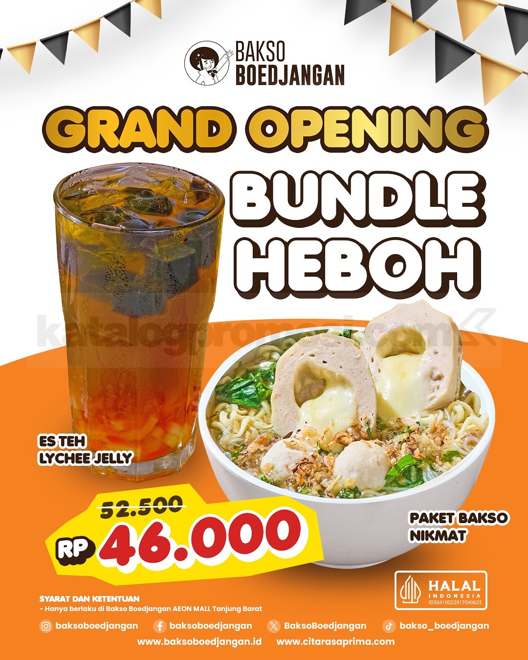 Promo Bakso Boedjangan Paket Baru Rp55.000 eksklusif di AEON Mall Tanjung Barat! Nikmati bakso kuah laksa + Es Teh Lychee Jelly segar.