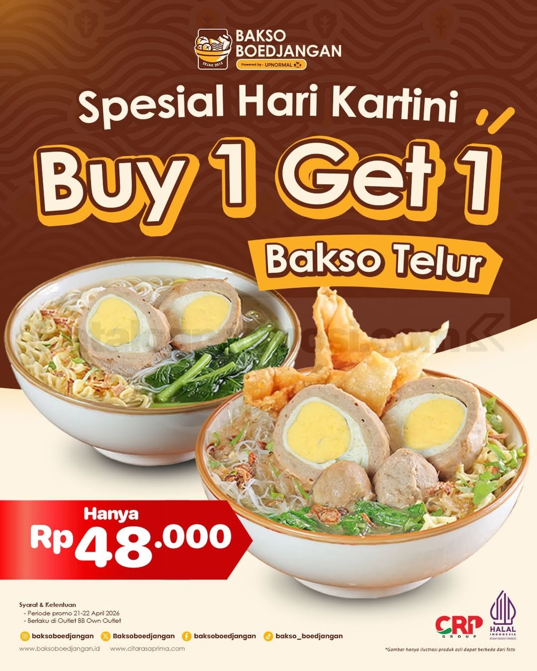 Promo ini berlaku selama periode 21 sampai 22 April 2026 dan bisa kamu nikmati di Bakso Boedjangan own outlet. Dengan harga segitu, kamu sudah bisa dapetin dua porsi bakso telur yang menggugah seleraβpas banget buat merayakan Hari Kartini dengan cara yang sederhana tapi tetap spesial πΈ