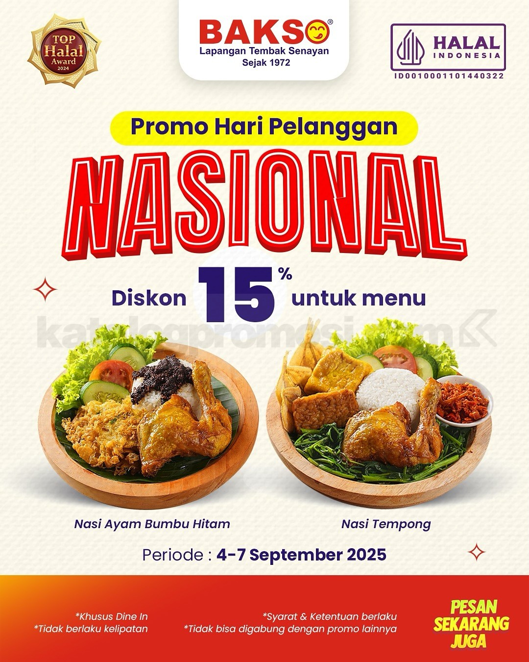 Promo Bakso Lapangan Tembak Senayan Harpelnas diskon 15% menu Nasi Tempong & Nasi Ayam Bumbu Hitam, berlaku 4β7 September 2025 di outlet tertentu.