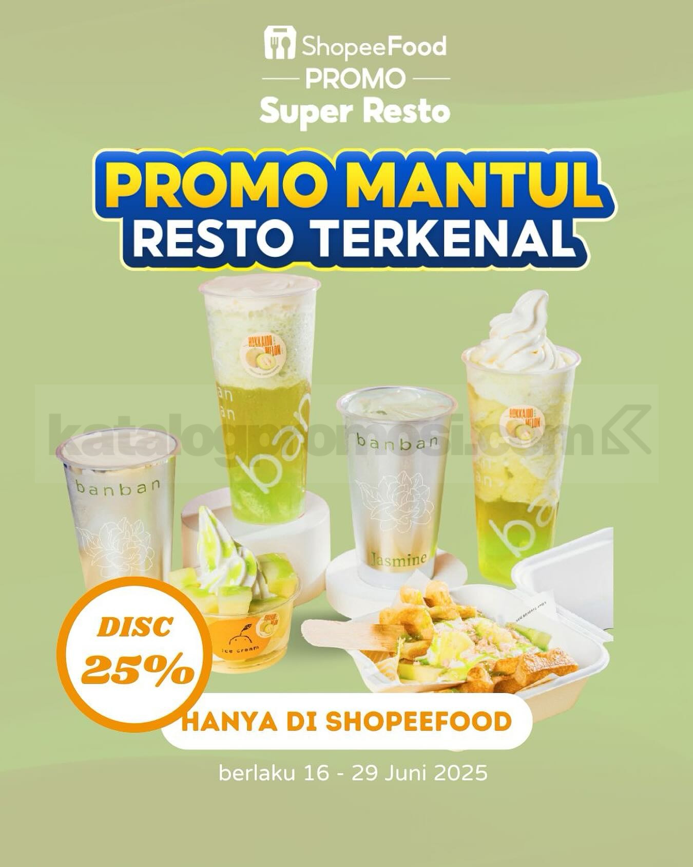 Promo Ban Ban Tea ShopeeFood Super Resto Diskon 25% berlaku tanggal 16–29 Juni 2025. Buruan klaim sebelum kehabisan kuota!