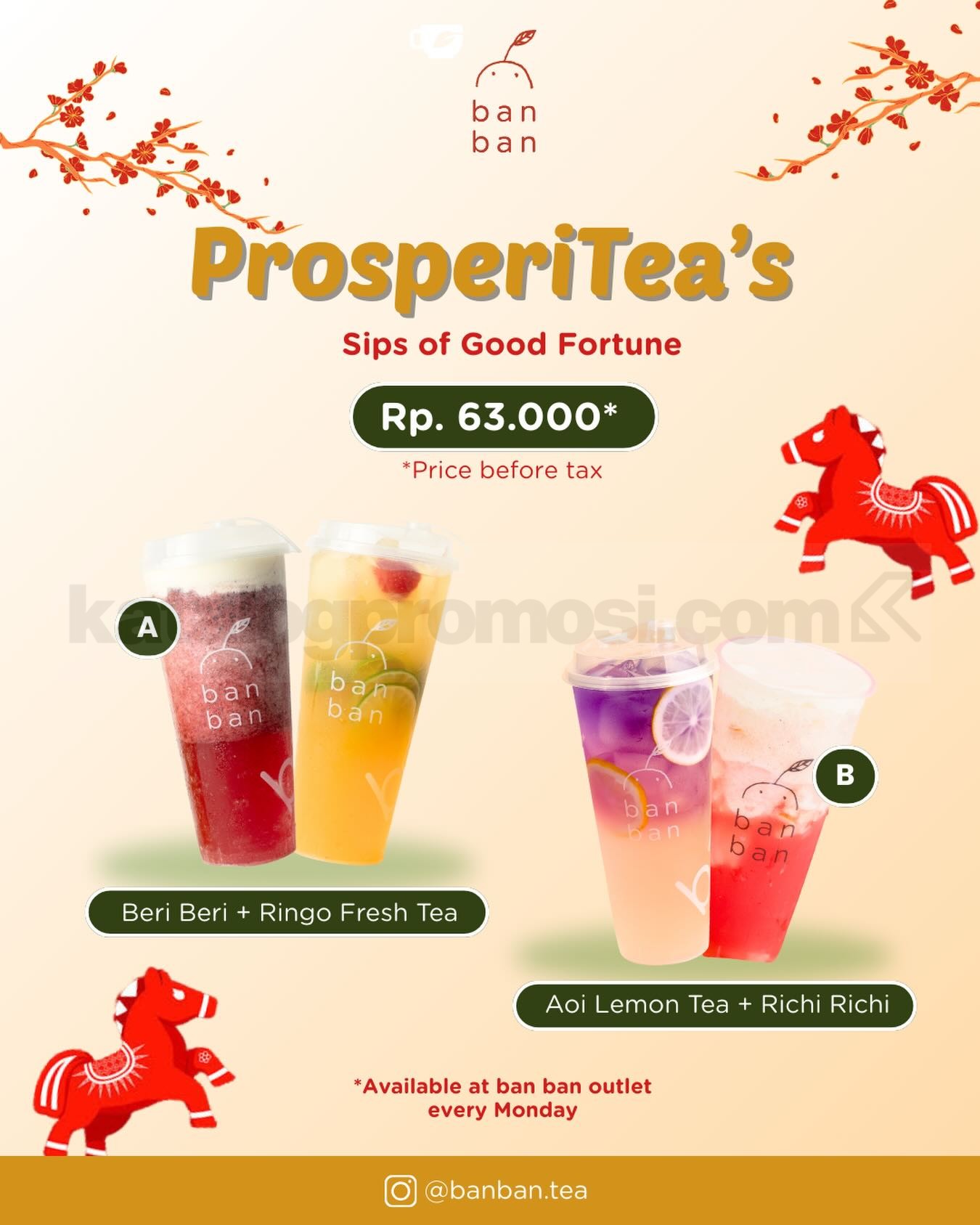 Promo Banban Prosperi-tea Pairs Rp. 70.000 tersedia terbatas setiap hari Senin dan Selasa di seluruh outlet Banban selama periode promo berlangsung.