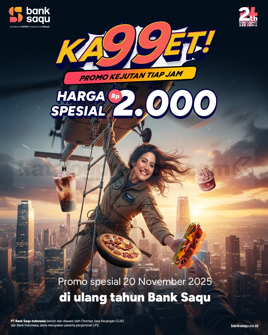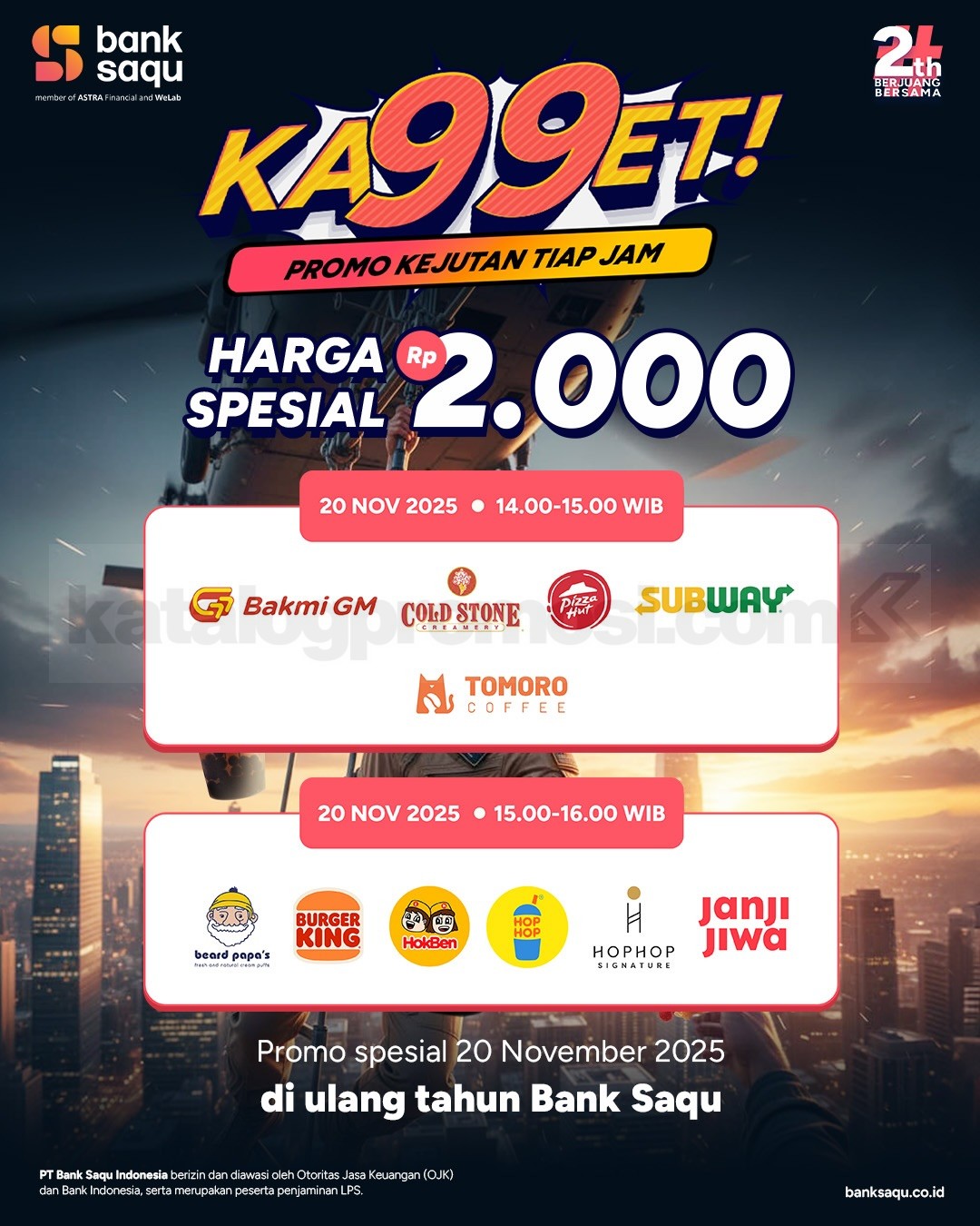 Promo Bank Saqu Anniversary Serba Rp. 2.000 berlaku 20 November 2025 di 10 merchant populer seperti Bakmi GM, Pizza Hut, HokBen, Burger King, dan banyak lagi.