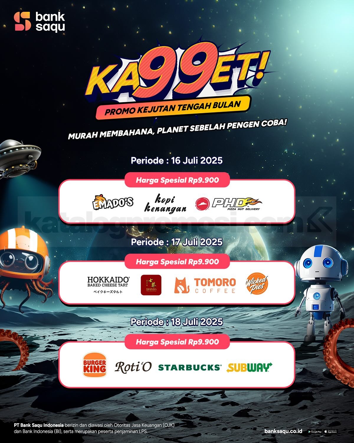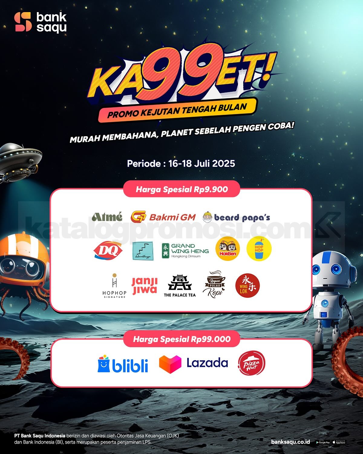 Promo Bank Saqu Anniversary Serba Rp. 2.000 berlaku 20 November 2025 di 10 merchant populer seperti Bakmi GM, Pizza Hut, HokBen, Burger King, dan banyak lagi.