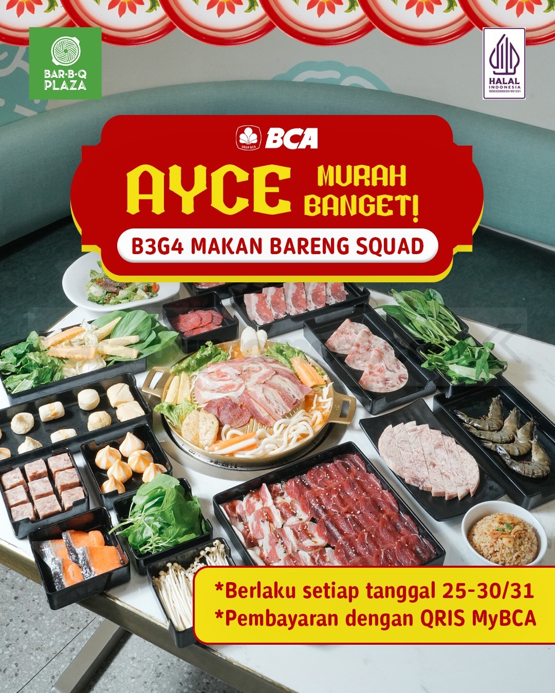 Yuk, buruan manfaatin Promo Bar.B.Q Plaza BUY 3 GET 4 sebelum kehabisan! Promo ini cocok buat kamu yang suka makan ramean, pengen puas makan All You Can Eat, tapi tetap hemat 💸 Jangan tunggu last minute, langsung booking dan siapin QRIS MyBCA kamu sekarang juga! 🔥✨