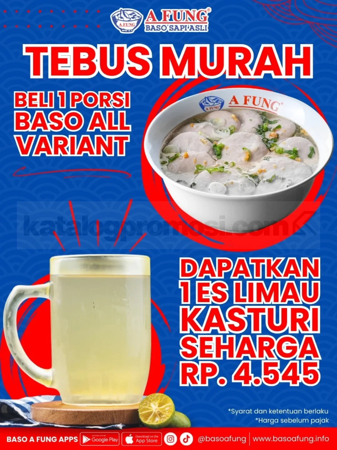 Jangan tunggu lama-lama, langsung gasin ke cabang Baso A Fung yang terdekat! Dengan Promo Baso A Fung Tebus Murah Es Limau Kasturi, makan baso jadi makin nikmat dan lengkap. Buruan cobain sebelum promonya habis, Afunglovers! 😍