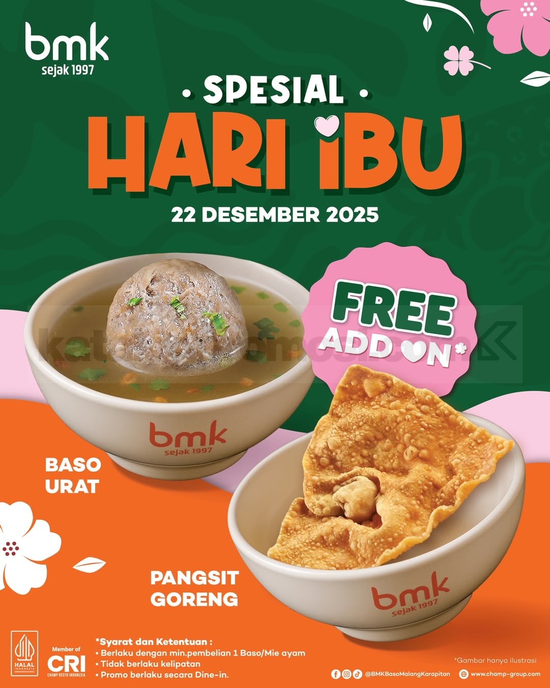 Lewat promo ini, setiap pelanggan yang makan di tempat dan memesan satu menu Baso atau Mie Ayam akan mendapatkan pangsit goreng gratis sebagai pelengkap. Cocok dinikmati sambil berbagi cerita dan kehangatan bersama Ibu tercinta 🤍