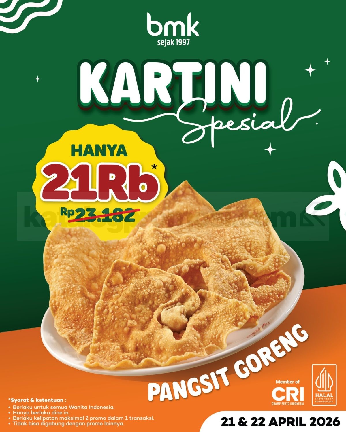 Promo Baso Malang Karapitan Hari Kartini Pangsit Goreng Rp.21.000 berlaku selama periode Hari Kartini sesuai ketentuan program di outlet Baso Malang Karapitan khusus transaksi dine-in untuk pelanggan wanita Indonesia.