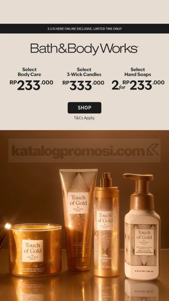 Promo Bath & Body Works 3.3 Online Exclusive menghadirkan Select Body Care Rp. 233.000, Select 3-Wick Candles Rp. 333.000, dan Select Hand Soaps 2 for Rp. 233.000 dengan akses khusus online dalam periode terbatas.