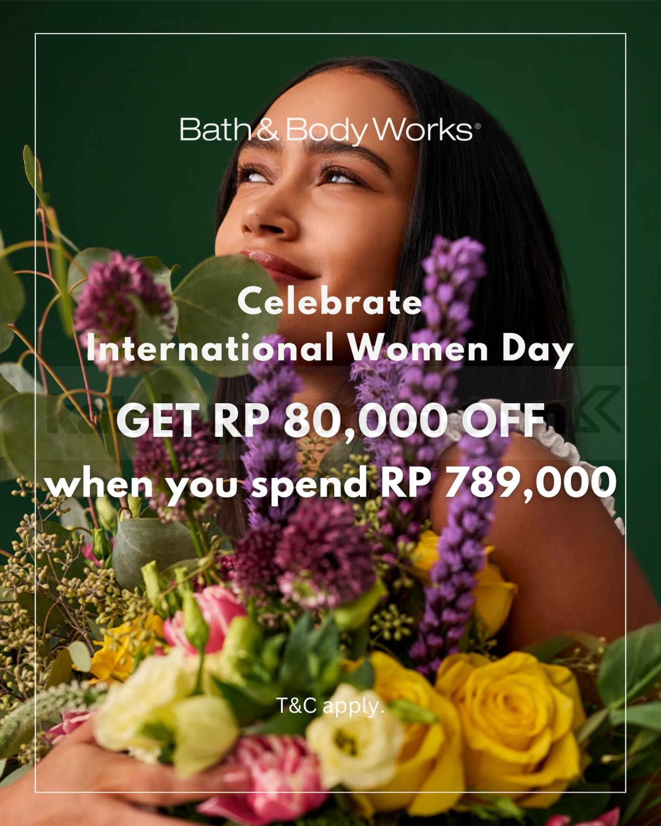 Promo Bath & Body Works International Women Day Diskon Rp. 80.000 berlaku 8 Maret 2026 untuk pembelian minimal Rp. 789.000 di Bath & Body Works.