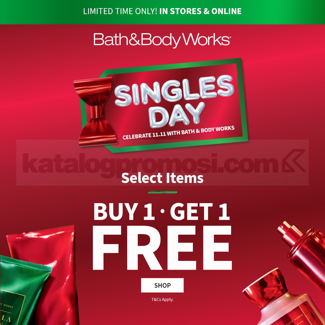 Promo Bath & Body Works Singles Day beli 1 gratis 1 untuk produk pilihan, berlaku 7-11 November 2025 di seluruh Bath & Body Works Indonesia.