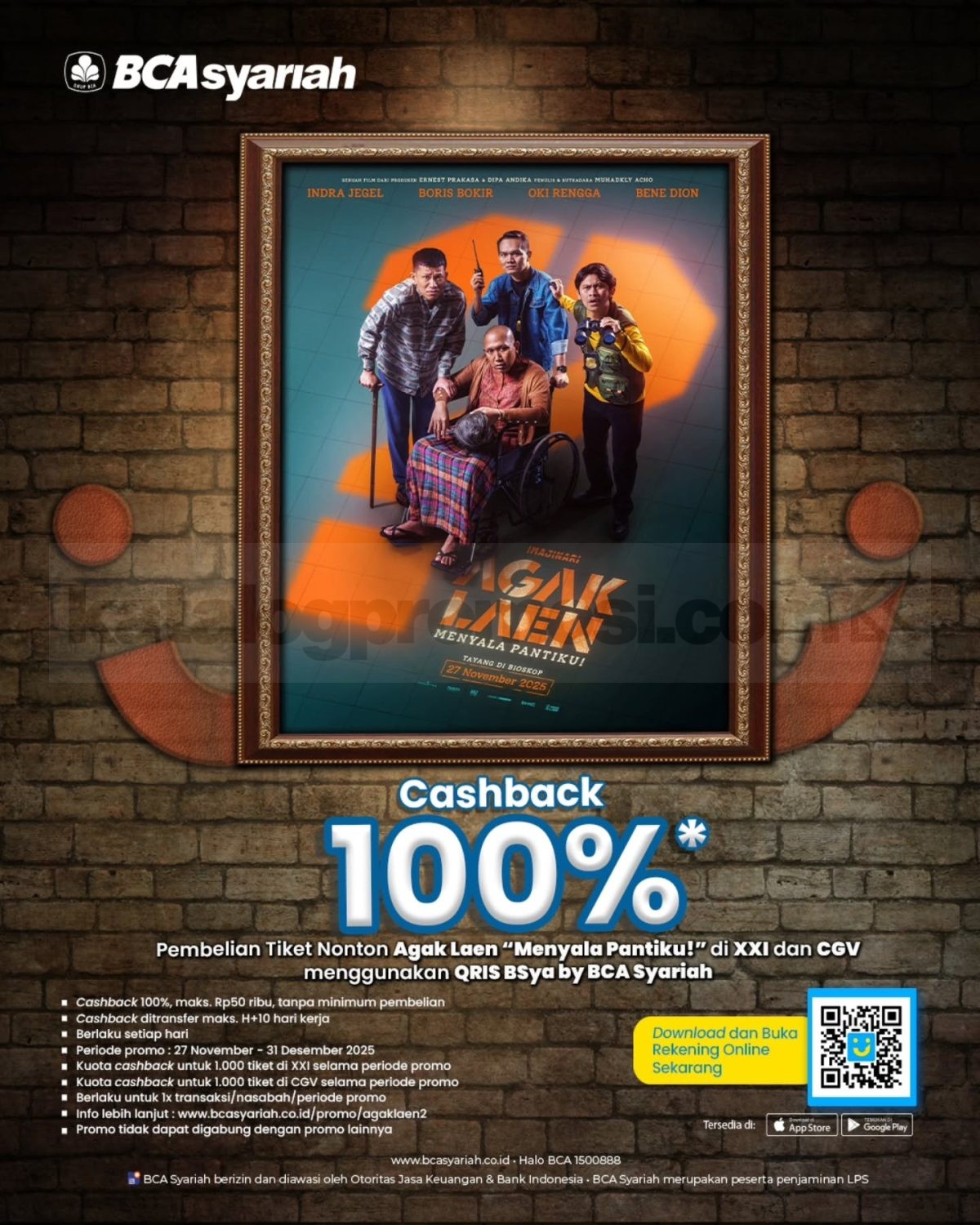 Promo BCA Syariah Cashback 100% tiket nonton film Agak Laen: Menyala Pantiku di XXI dan CGV berlaku mulai tanggal 27 November – 31 Desember 2025. Bayar pakai QRIS BSya.