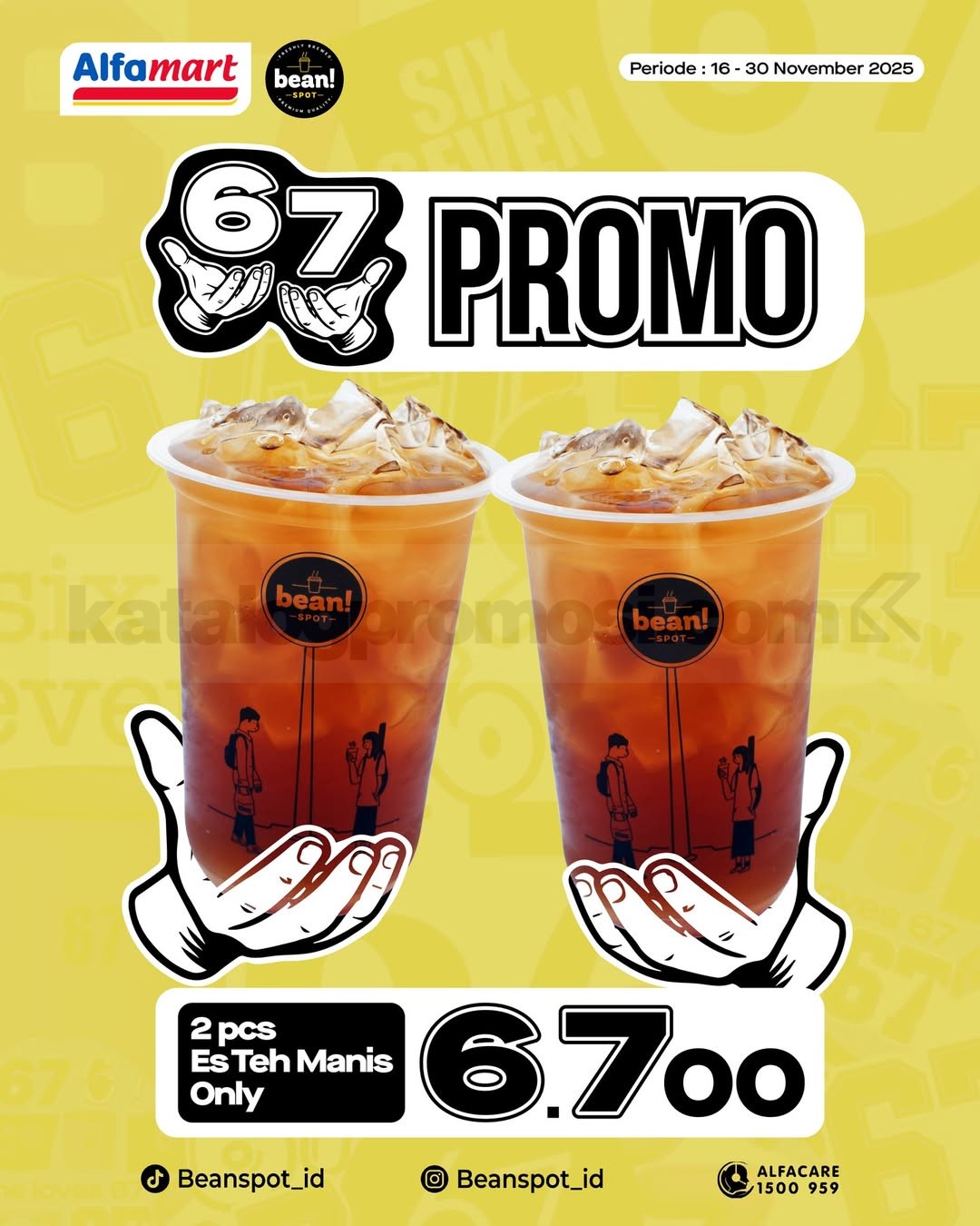 Promo Beanspot 6.7 Beli 2 Es Teh cuma Rp. 6.700, seger & hemat + nikmati vibes segarnya, berlaku 16-30 November 2025 di seluruh outlet.