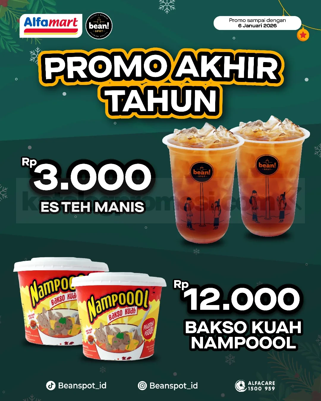 Promo Beanspot Akhir Tahun mulai Rp. 3.000 dengan menu hangat dan minuman segar, berlaku sampai tanggal 6 Januari 2026.