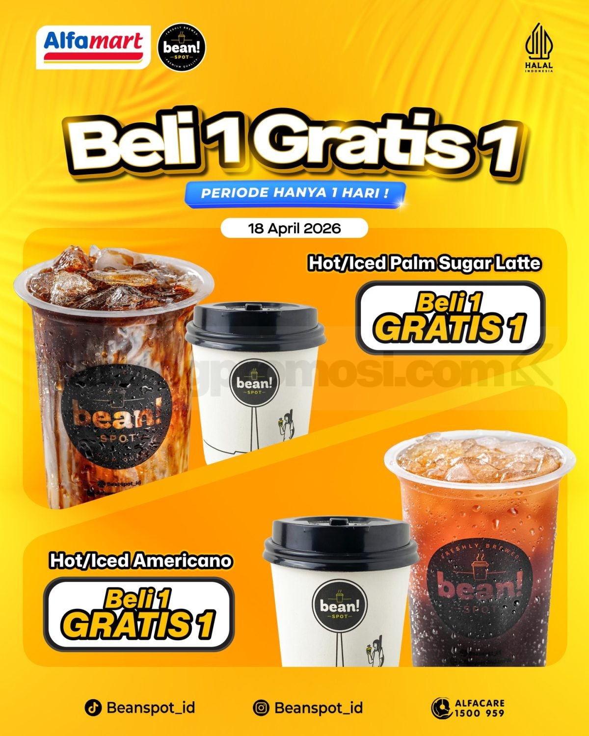 Promo Beanspot Beli 1 Gratis 1 Kopi Favorit hanya 1 hari, tanggal 18 April 2026 beli Palm Sugar Latte atau Americano gratis 1 varian sama di outlet Beanspot.