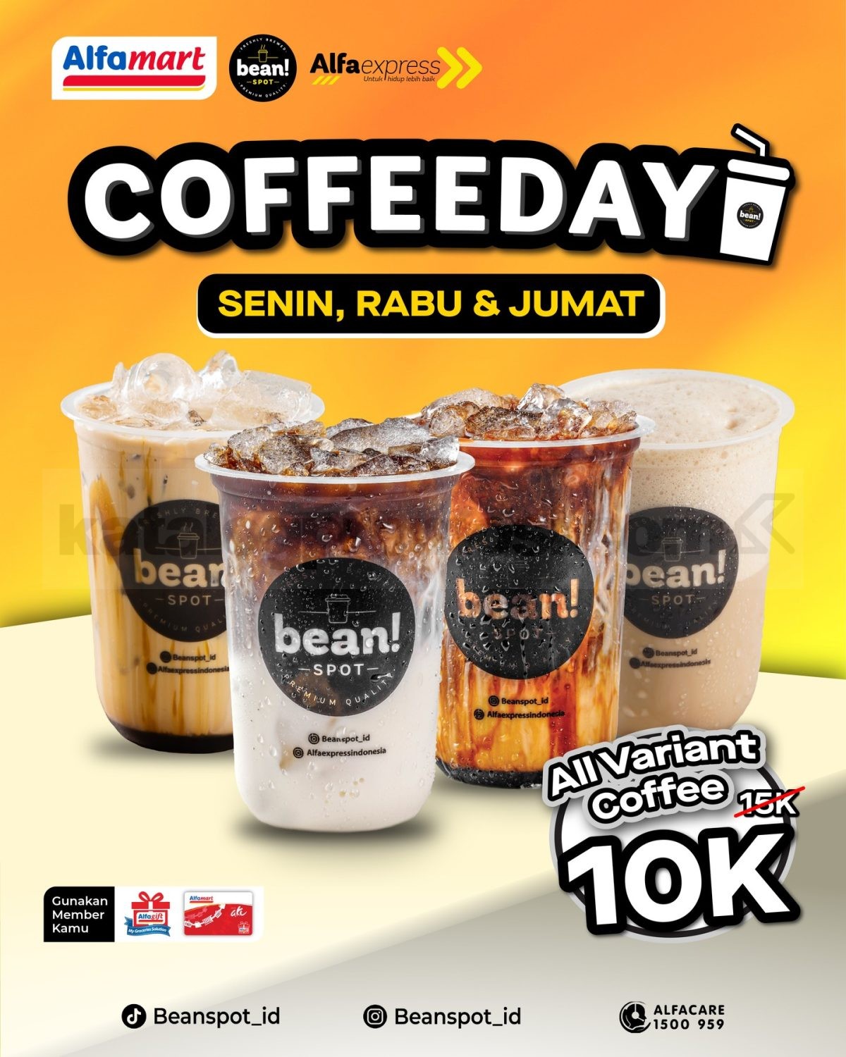 Manfaatkan Promo Beanspot Coffee Day Semua Varian Mulai Rp. 10.000 untuk memulai hari dengan kopi favoritmu dan energi yang lebih segar setiap Senin, Rabu, dan Jumat! ☕✨