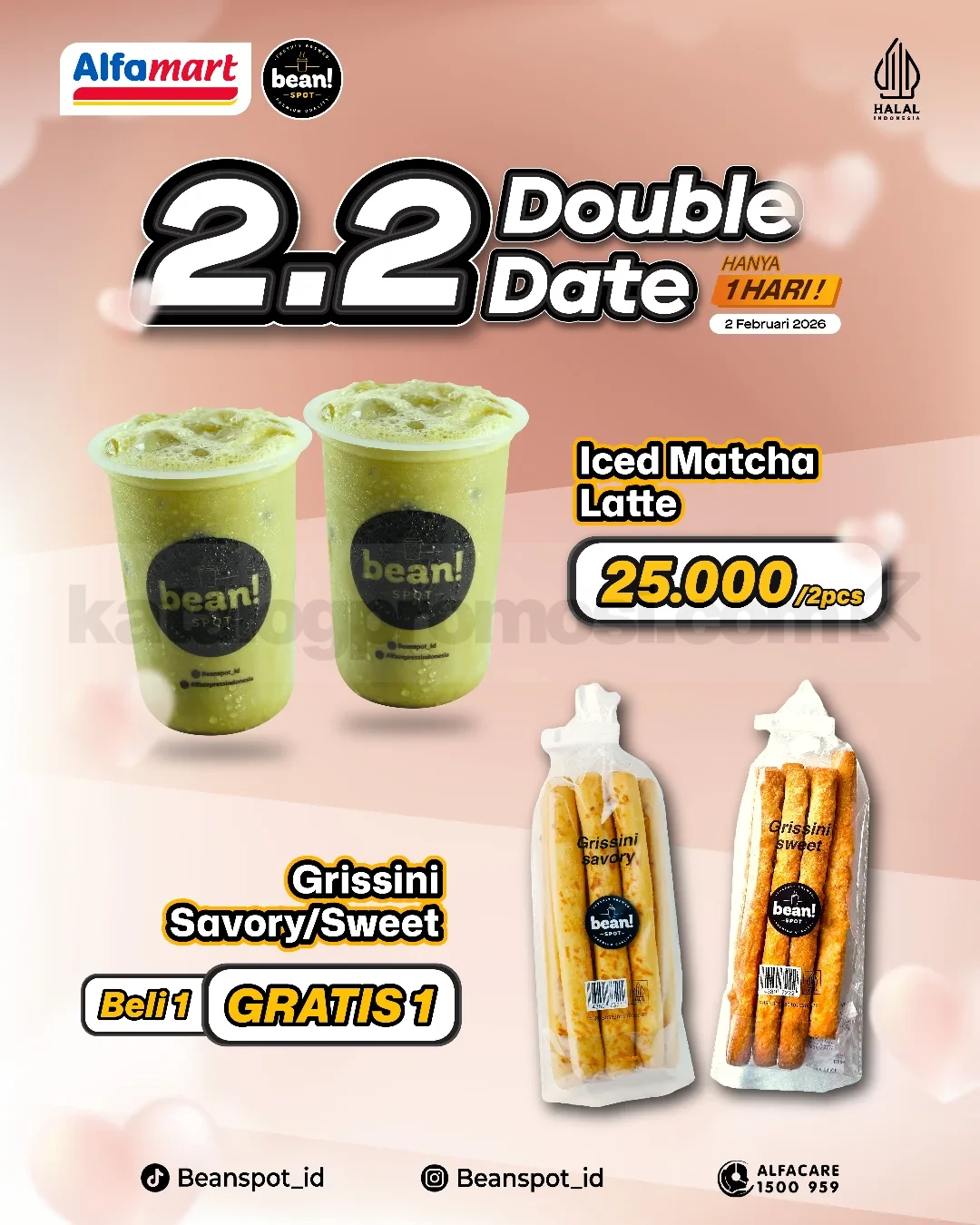 Promo BeanSpot Double Date 2.2 Beli 1 GRATIS 1 berlaku hanya di tanggal 2 Februari 2026 di Alfamart BeanSpot terdekat untuk menu pilihan.