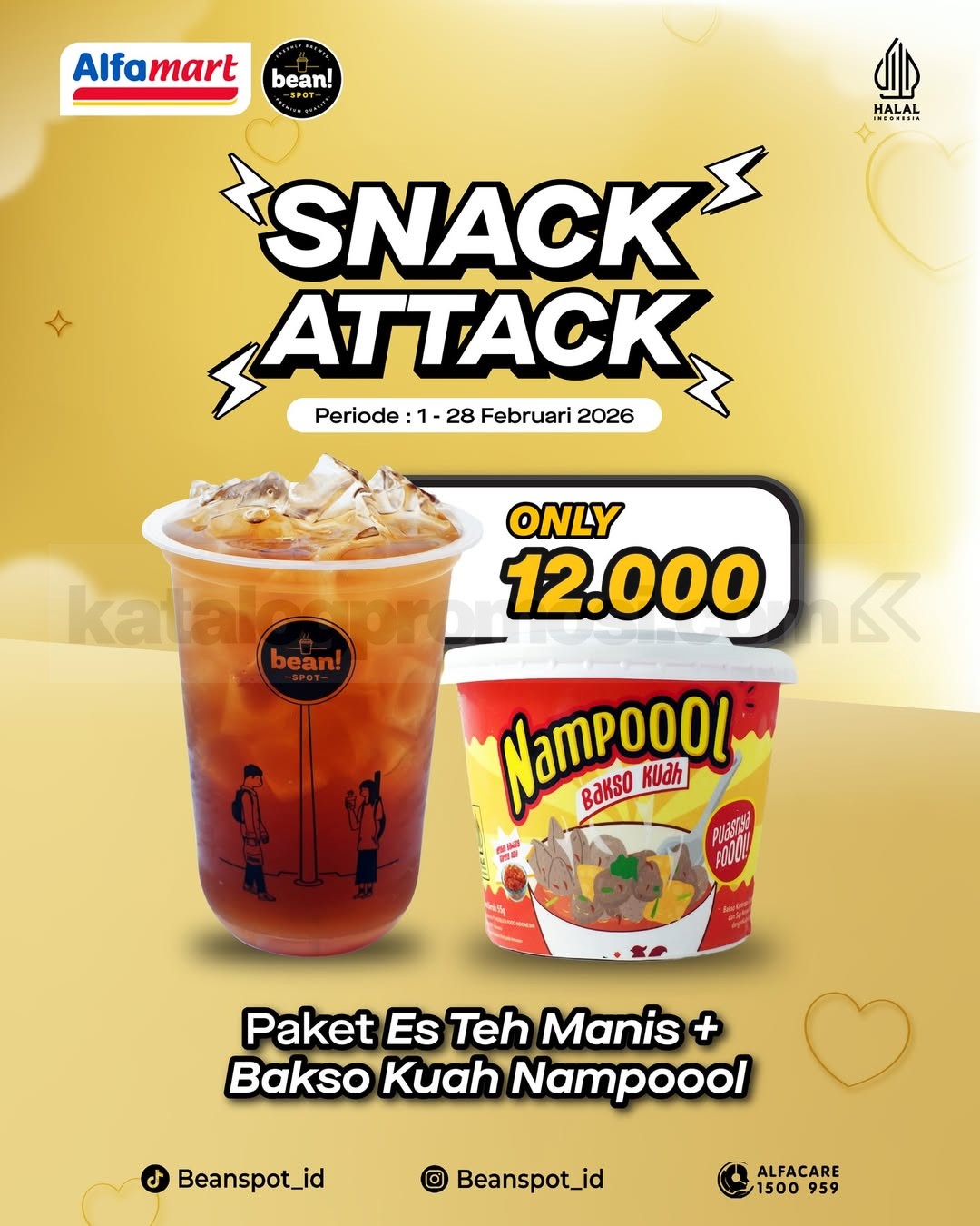 Promo Beanspot Paket Snack Attack Rp. 12.000 berisi bakso kuah dan es teh manis untuk ngemil santai, berlaku mulai tanggal 01 Februari 2026 – 28 Februari 2026