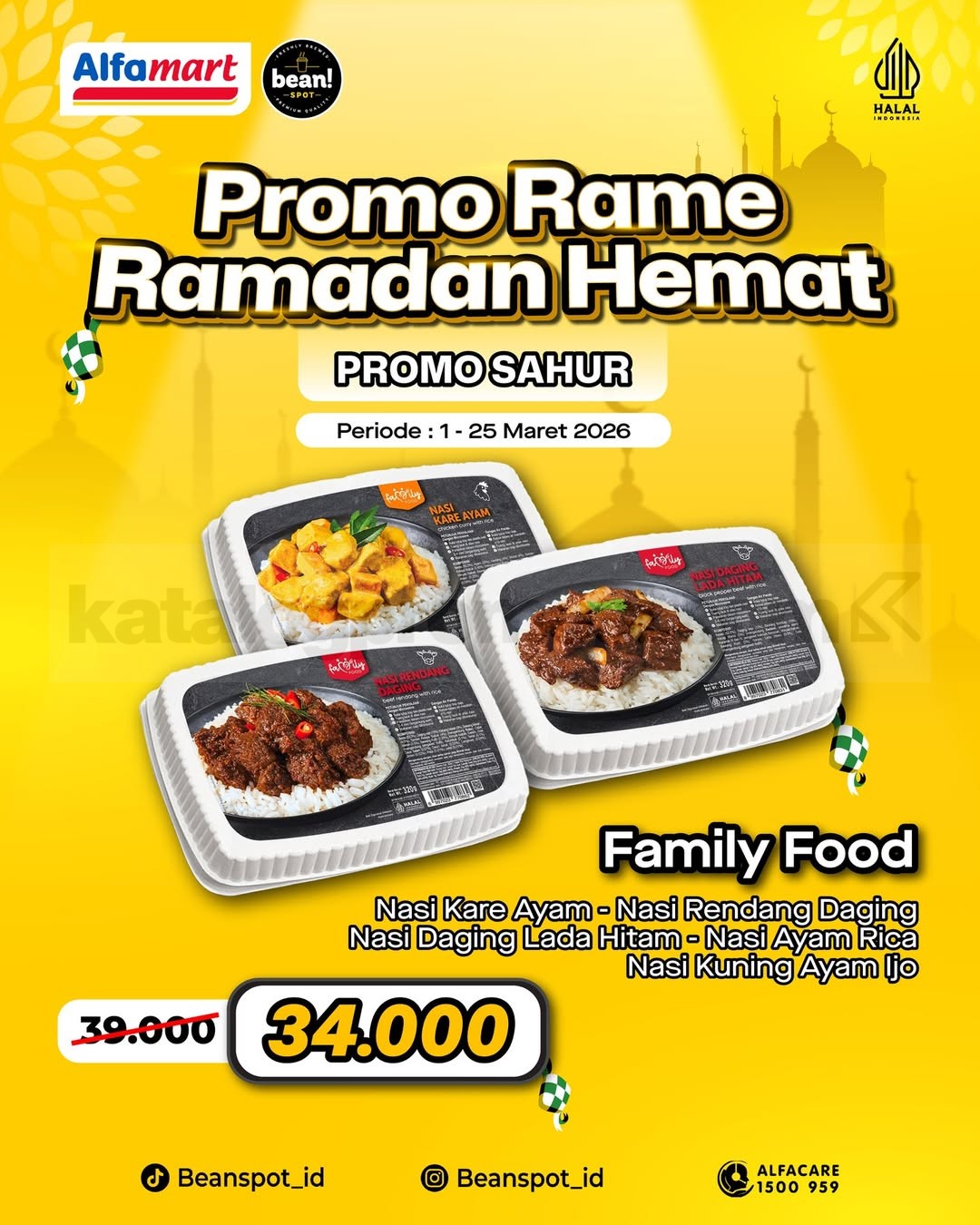 Dalam promo Ramadan ini, Beanspot menghadirkan menu Family Food favorit dengan harga spesial Rp. 34.000 per porsi. Periode promo berlaku mulai 1 Maret 2026 sampai 25 Maret 2026, jadi kamu punya banyak waktu untuk menikmati pilihan menu yang menggugah selera.