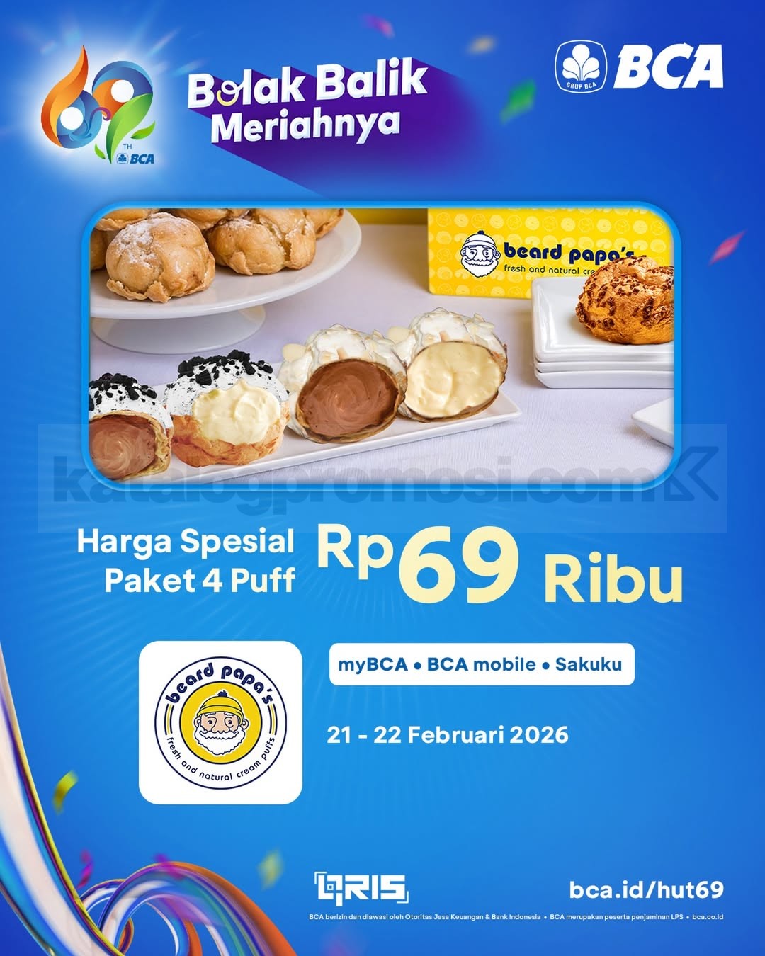 Promo Beard Papa’s BCA 69th Anniversary 4 Puffs Rp. 69.000 nikmati 4 Mixed Puffs bayar QRIS BCA berlaku mulai tanggal 21 Februari 2026 – 22 Februari 2026 di seluruh outlet