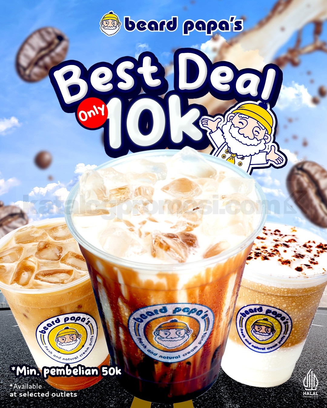 Promo spesial dari Beard Papa’s yang menawarkan minuman Rp. 10.000 dan paket Puff & Drink Combo Rp. 35.000.