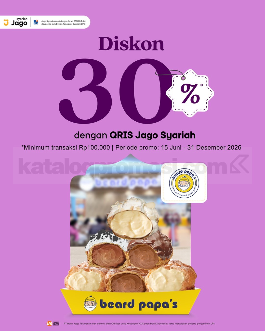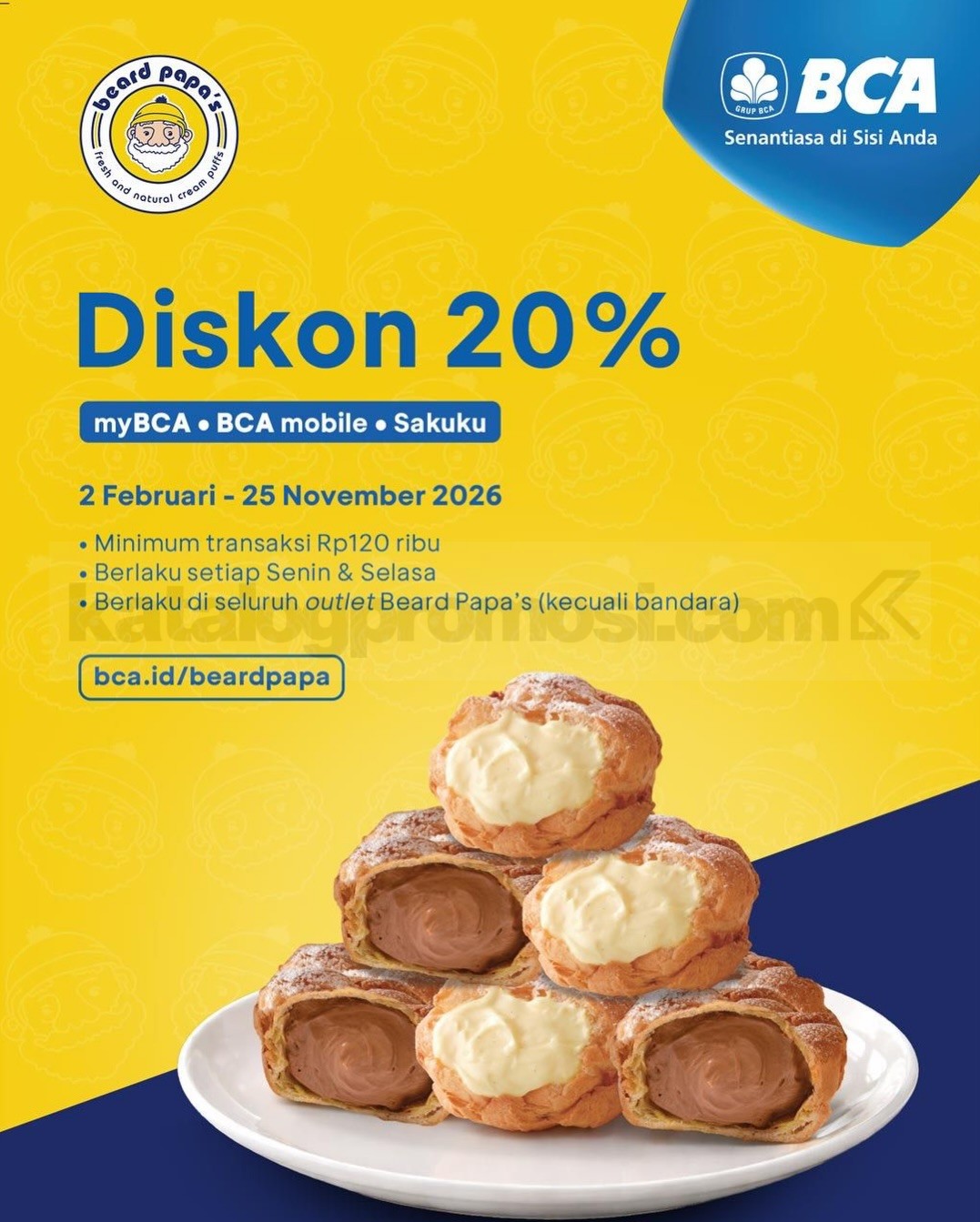 Promo Beard Papa’s February Bank Deals diskon hingga 100% dengan kartu dan QRIS bank pilihan, cashback dan reward points berlaku mulai 1 Februari 2026 – 28 Februari 2026 di seluruh outlet.