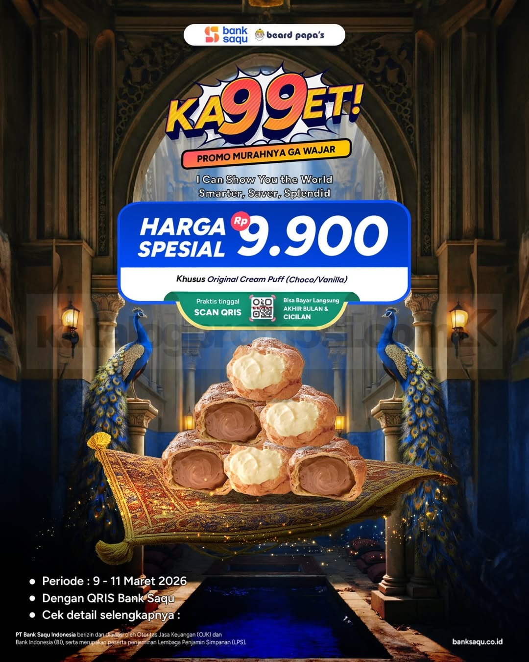 Promo ini berlangsung terbatas mulai 9 Maret hingga 11 Maret 2026 dan berlaku di hampir seluruh outlet Beard Papa’s. Setiap pelanggan dapat menikmati promo ini maksimal satu transaksi per hari dengan metode pembayaran QRIS Bank Saqu.
