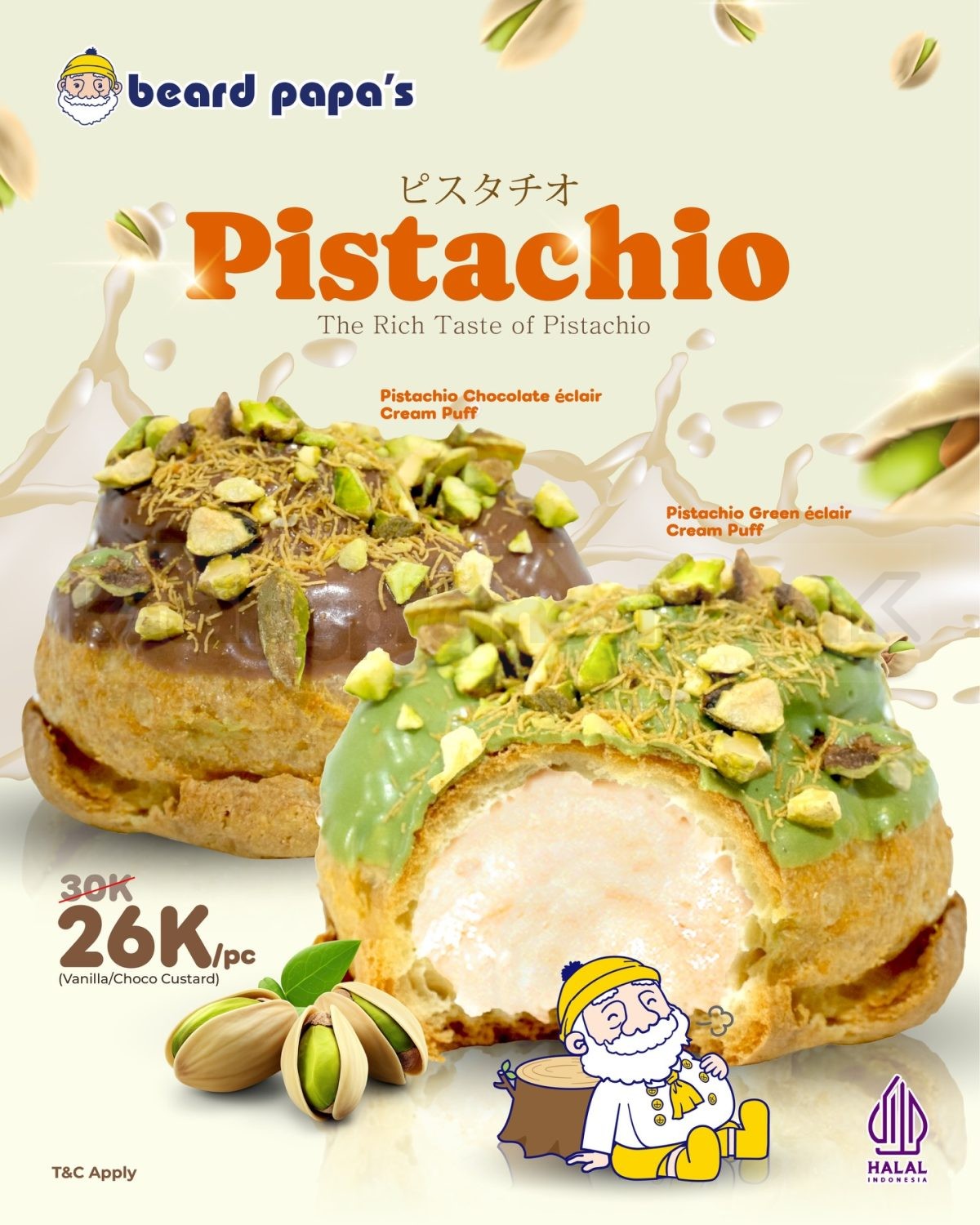 Promo Beard Papa’s Pistachio Éclair Crunchy mulai Rp. 26.000 dengan topping pistachio renyah tersedia offline, berlaku periode terbatas di mall dan stasiun.
