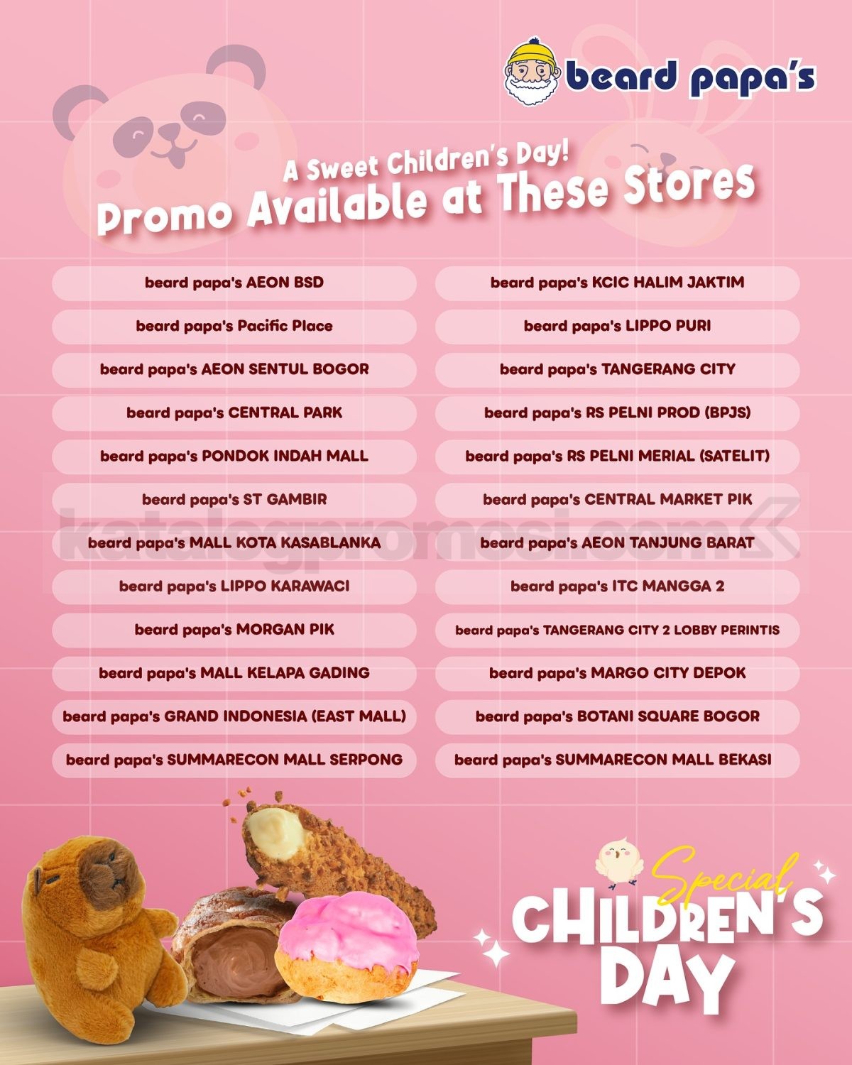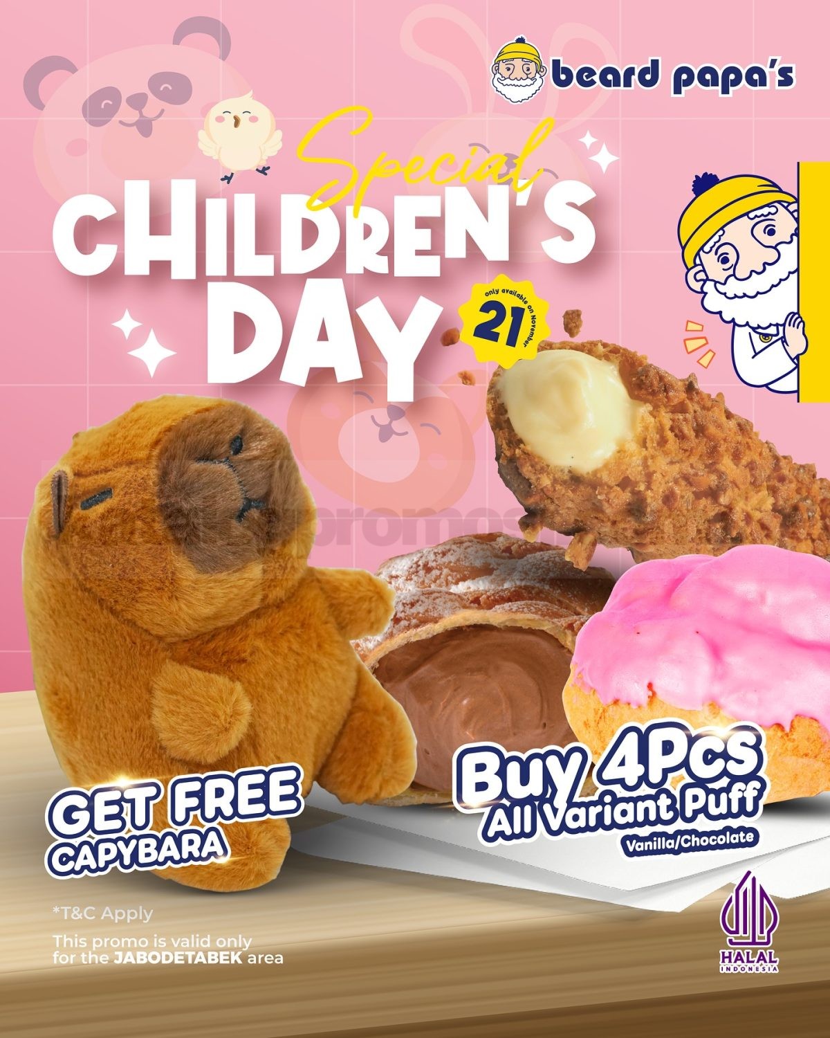 Promo Beard Papa’s Special Children’s Day Puff 4pcs Free Merchandise untuk pembelian minimal empat puff chocolate atau vanilla berlaku 21 November 2025 di seluruh outlet Jabodetabek.