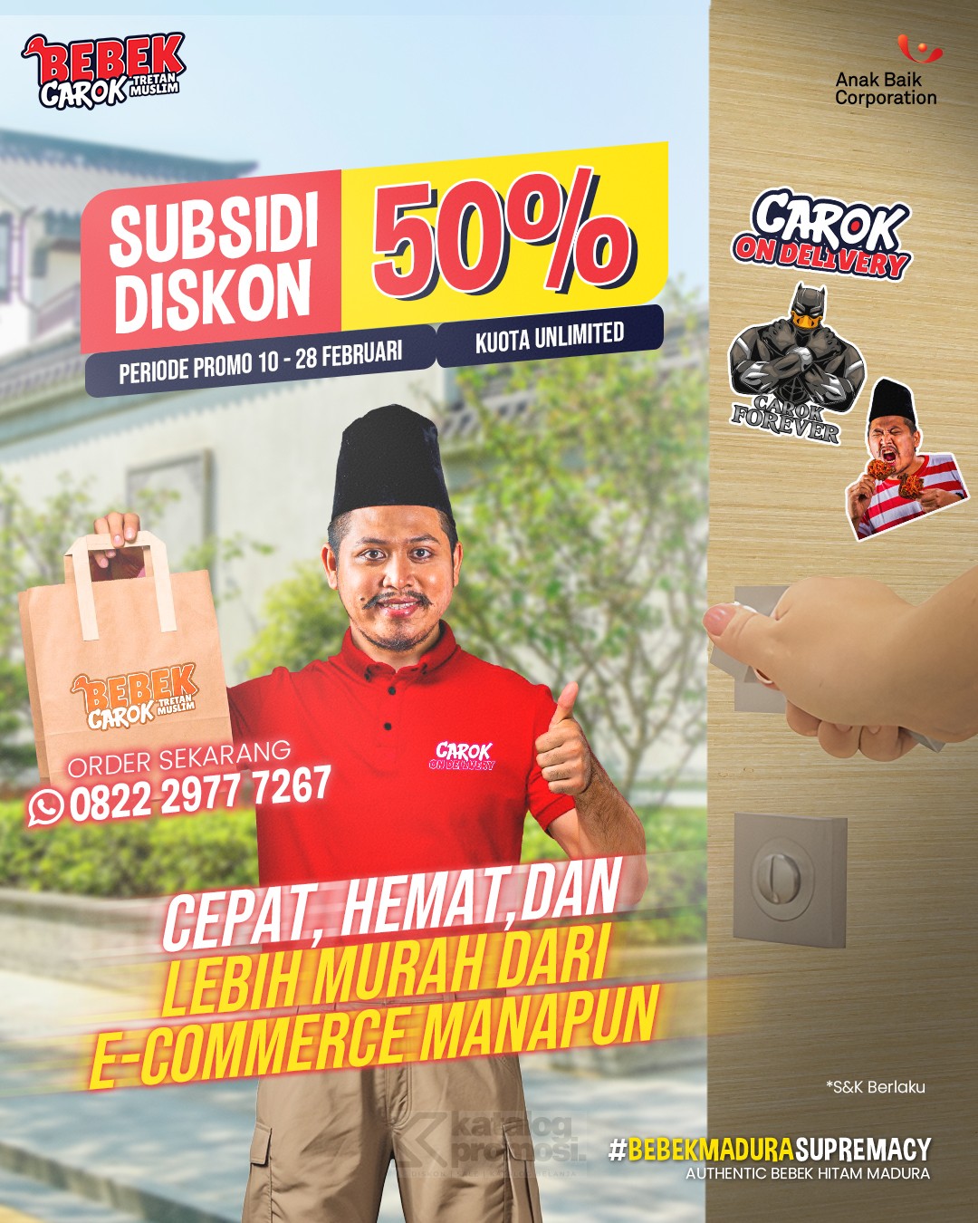 Dengan promo ini, kamu bisa menikmati potongan harga 50% untuk layanan Bebek Carok On Delivery dengan minimum pembelian Rp. 100.000. Cocok untuk makan rame-rame, stok makan keluarga, atau sekadar nikmatin bebek favorit tanpa bikin dompet menjerit.