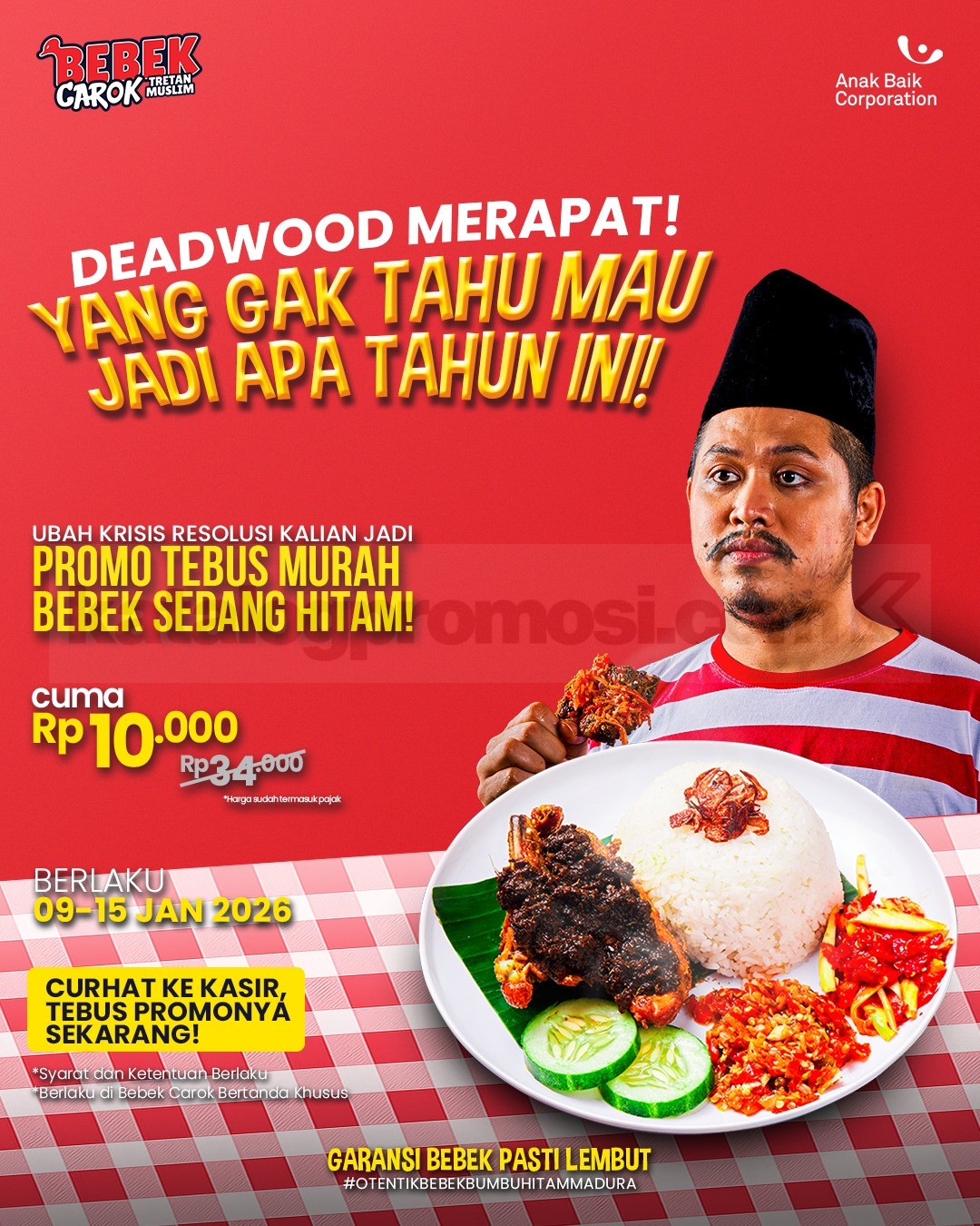 Promo Bebek Carok Tebus Murah Bebek Sedang Hitam Rp. 10 ribu, ganti resolusi krisis jadi kenyang lewat mekanisme curhat ke kasir, berlaku mulai tanggal 9 Januari 2026 – 15 Januari 2026 di outlet bertanda tertentu.