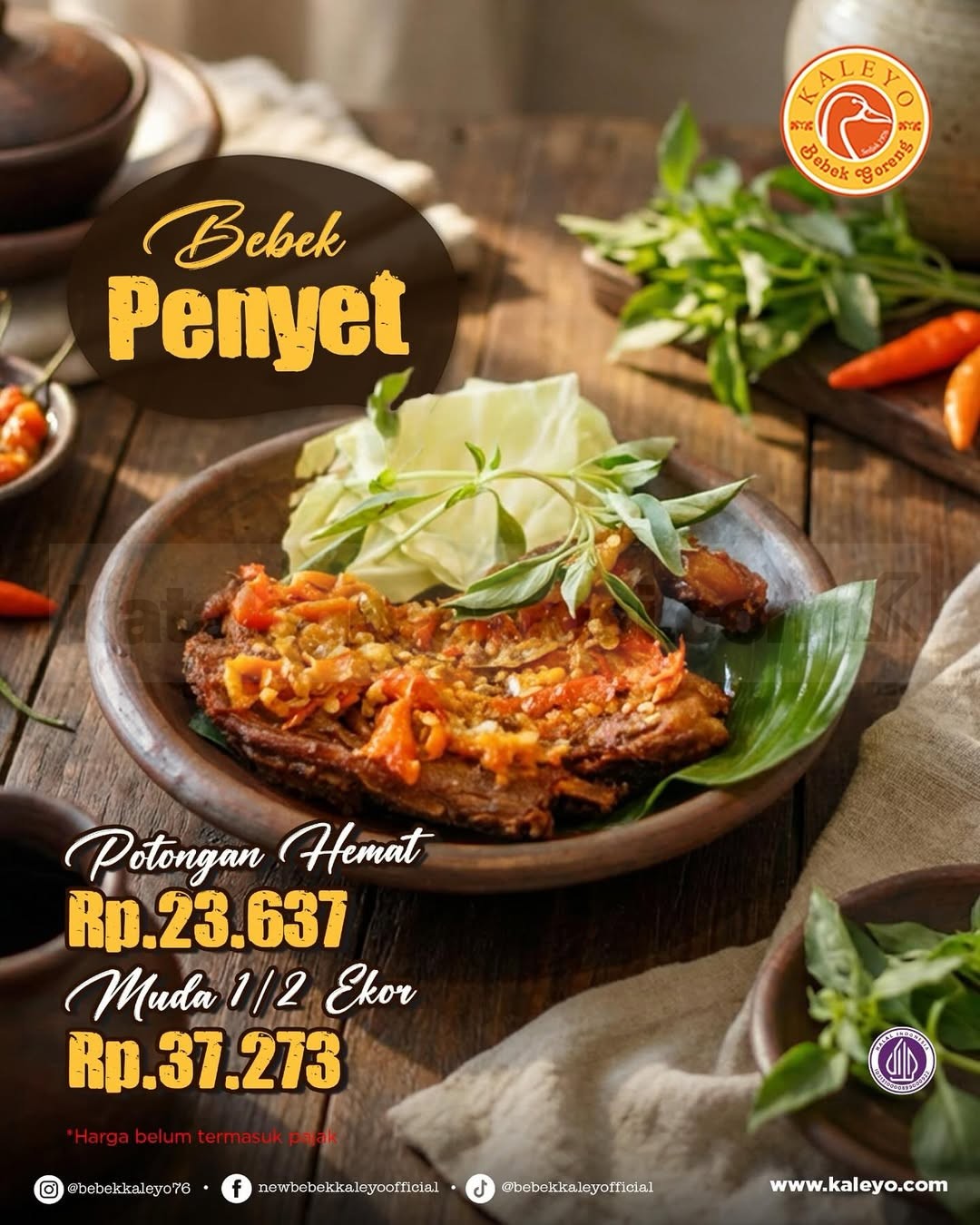 Promo Bebek Kaleyo Bebek Penyet mulai Rp 23.637, sambal digeprek dadakan pedasnya nampol, harga hemat belum termasuk pajak, semua outlet Bebek Kaleyo.