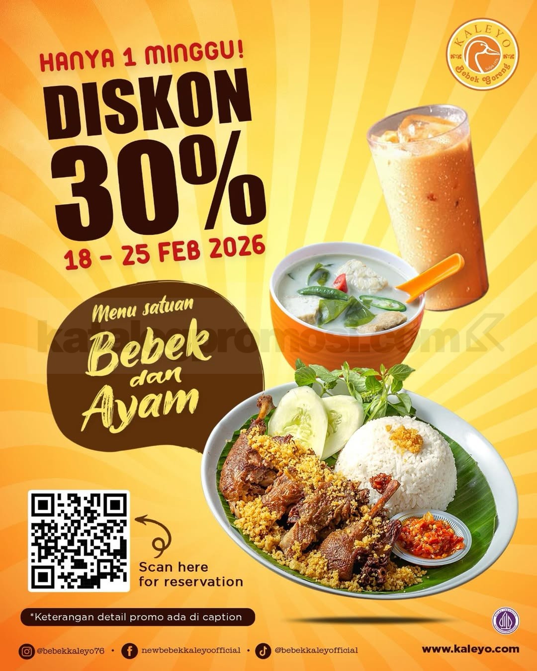 Promo Bebek Kaleyo Diskon 30% Menu Buka Puasa nikmati potongan harga semua menu bebek dan ayam berlaku mulai tanggal 18 Februari 2026 – 25 Februari 2026 di seluruh outlet