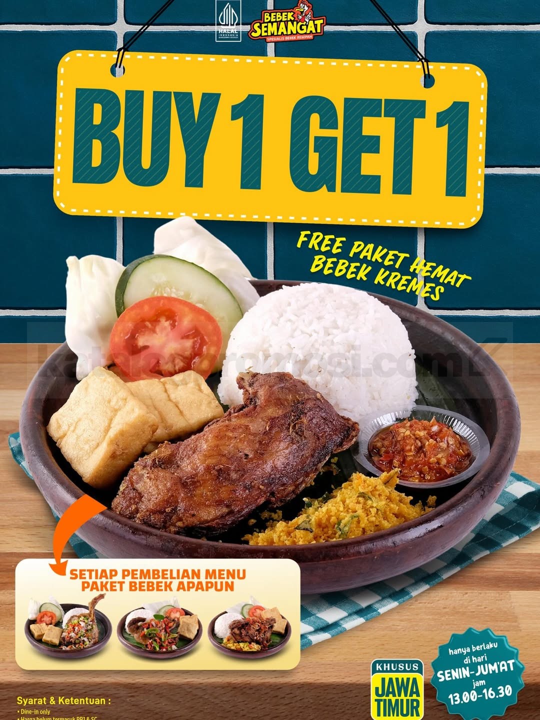 Promo Bebek Semangat Happy Hour Beli 1 Gratis 1 dapat Paket Hemat Bebek Kremes berlaku mulai tanggal Senin – Jumat pukul 13.00 – 16.30 di outlet tertentu
